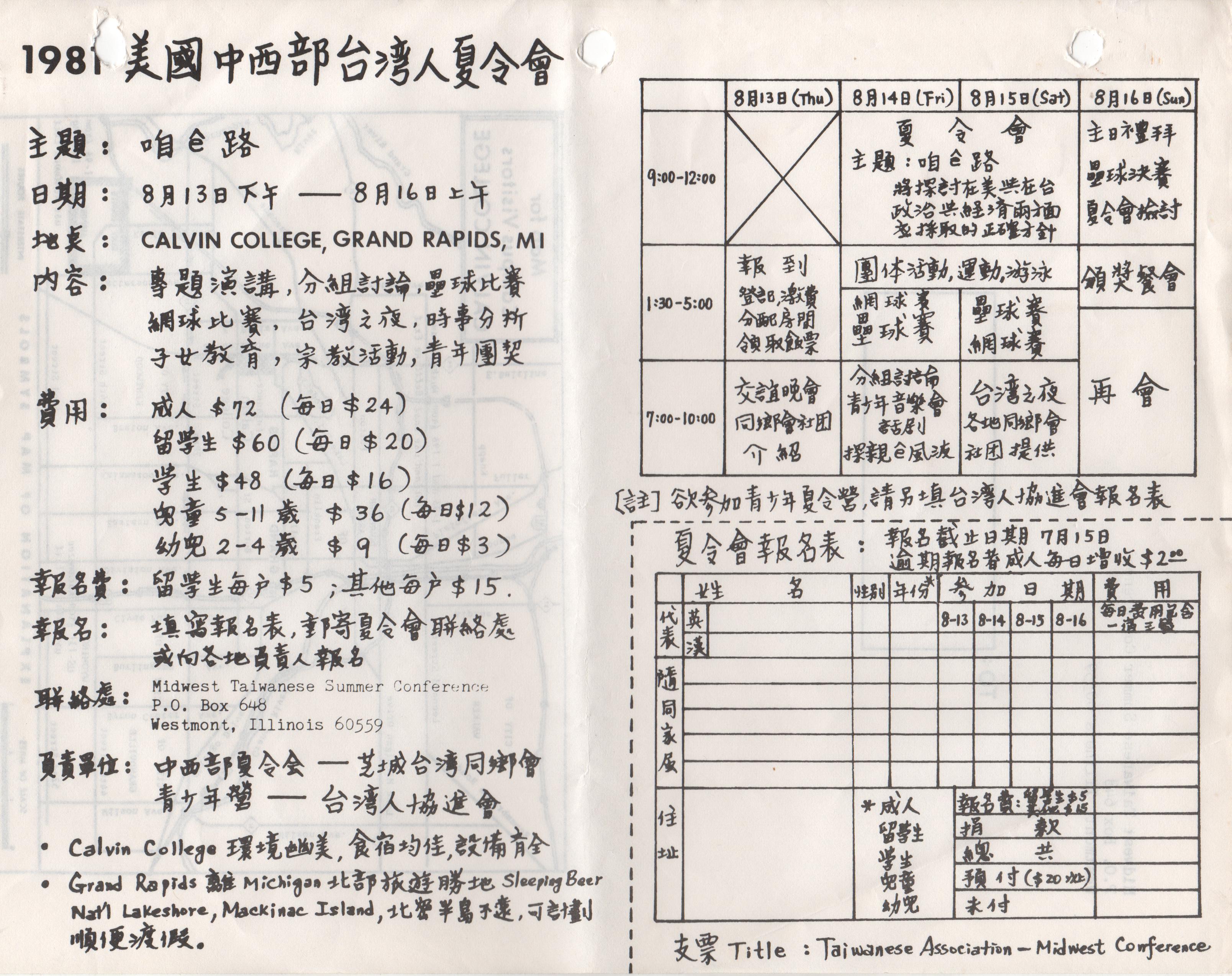 1981年美國中西部台灣人夏令會於八月十三日至十六日在卡爾文學院 (Calvin College, Grand Rapids, Michigan)擧行。今年的主題是“咱的路”。由芝加哥台灣同鄕會與台灣人協進會合辦,參加的人數大約600人。