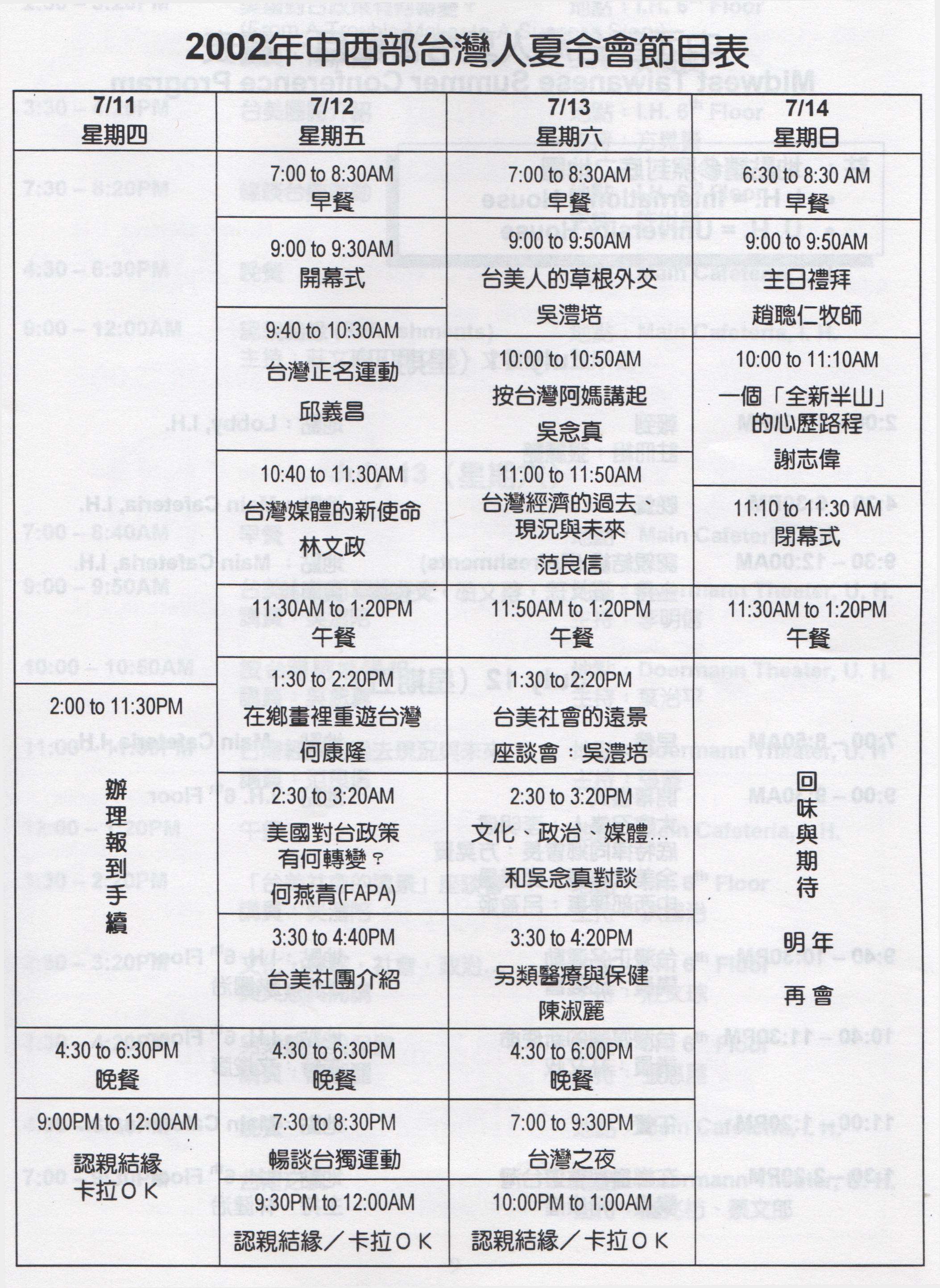 大會籌備會經過一年的策劃、討論與聯絡,安排出這次多元而緊湊的節目。包括多項專題演講以及討論座談,分別從文化、經濟、社會、以及國際形勢的層面,來探討台美人的發展。此外,也有台灣美術以及醫藥常識等講座。講員都是由台灣及美國各地邀請來的一時之選,希望能與大家共同切磋出新的概念與認知。除了演講和座談外,我們也準備了許多表演節目,將在星期六晚上的「台灣之夜」供您觀賞。當然,請您千萬不要錯過的,還有每天晩上最具中西部夏令會特色的「認親結緣」時間。希望能在這個輕鬆愉快的場合中,和您一起聊往事,喝啤酒,歡唱卡拉0K,共同留下美好的記憶。