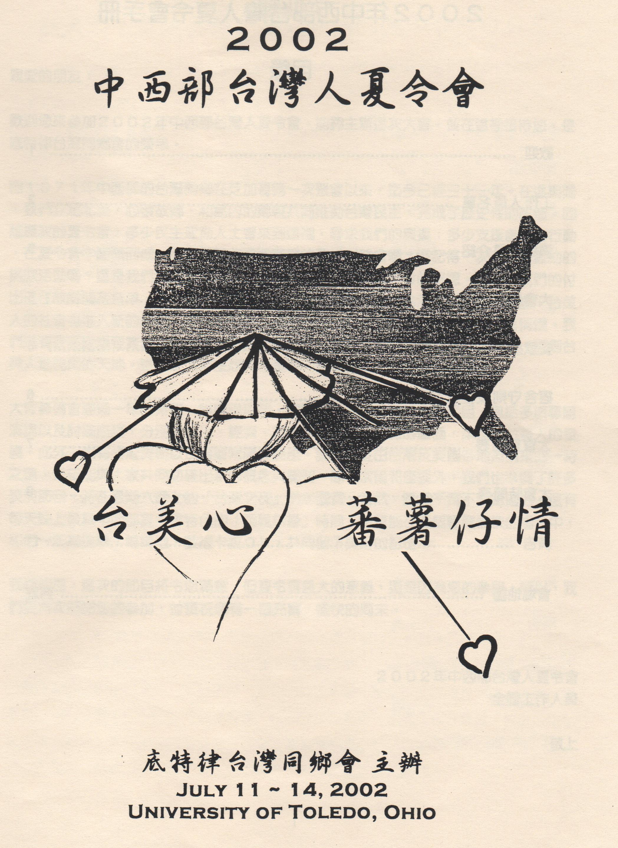 自1971年中西部的台灣同鄉在芝加哥第一次聚會以來,迄今已經三十一年。在這期間,我們立足北美,心懷故鄉,和島内的鄉親共同推動台灣民主,完成了歷史性的改造。回想歷次的夏令會,多少民主蓮動人士曾來到這裡,尋求我們的奧援;多少支援島内的行動,在夏令會中醞釀而成。還記得那些慷慨激昂的政治討論會嗎?還記得一次次傾囊義助的捐款活動嗎?這是我們成長的歷史,也是夏令會留給我們最珍貴的記憶。而今,我們的付出已在故鄕開花結果;曾經熱血奔騰的朋友,也已兩鬢漸白。台灣的政治環境改變,台美人的社會也進入新的階段。唯一不變的,是保藏在台美人心中,熱情洋溢的蕃薯情懷。我們還有許多理想要實現,也有更遠的目標要追尋。我們要發揚「蕃薯仔」的傳統,開創台美人更開闊的天地。這就是大會主題「台美心,蕃薯仔情」所要探討的議題。