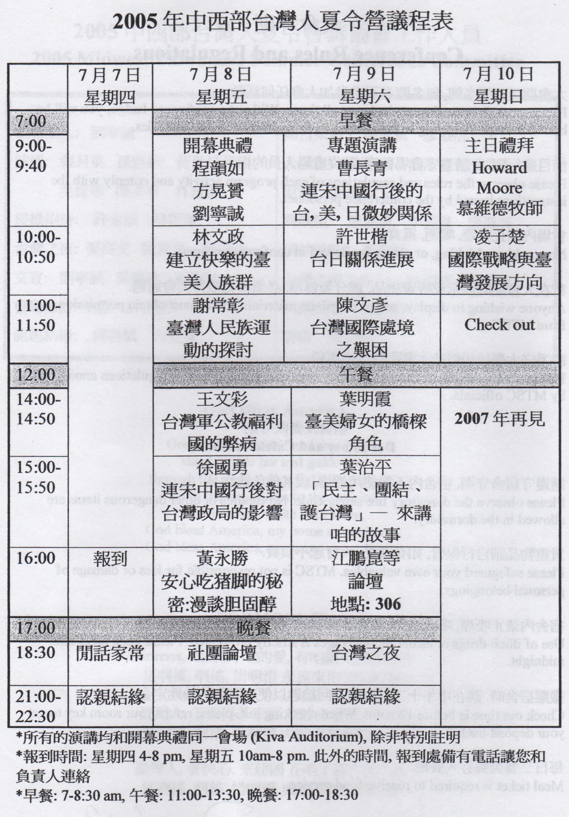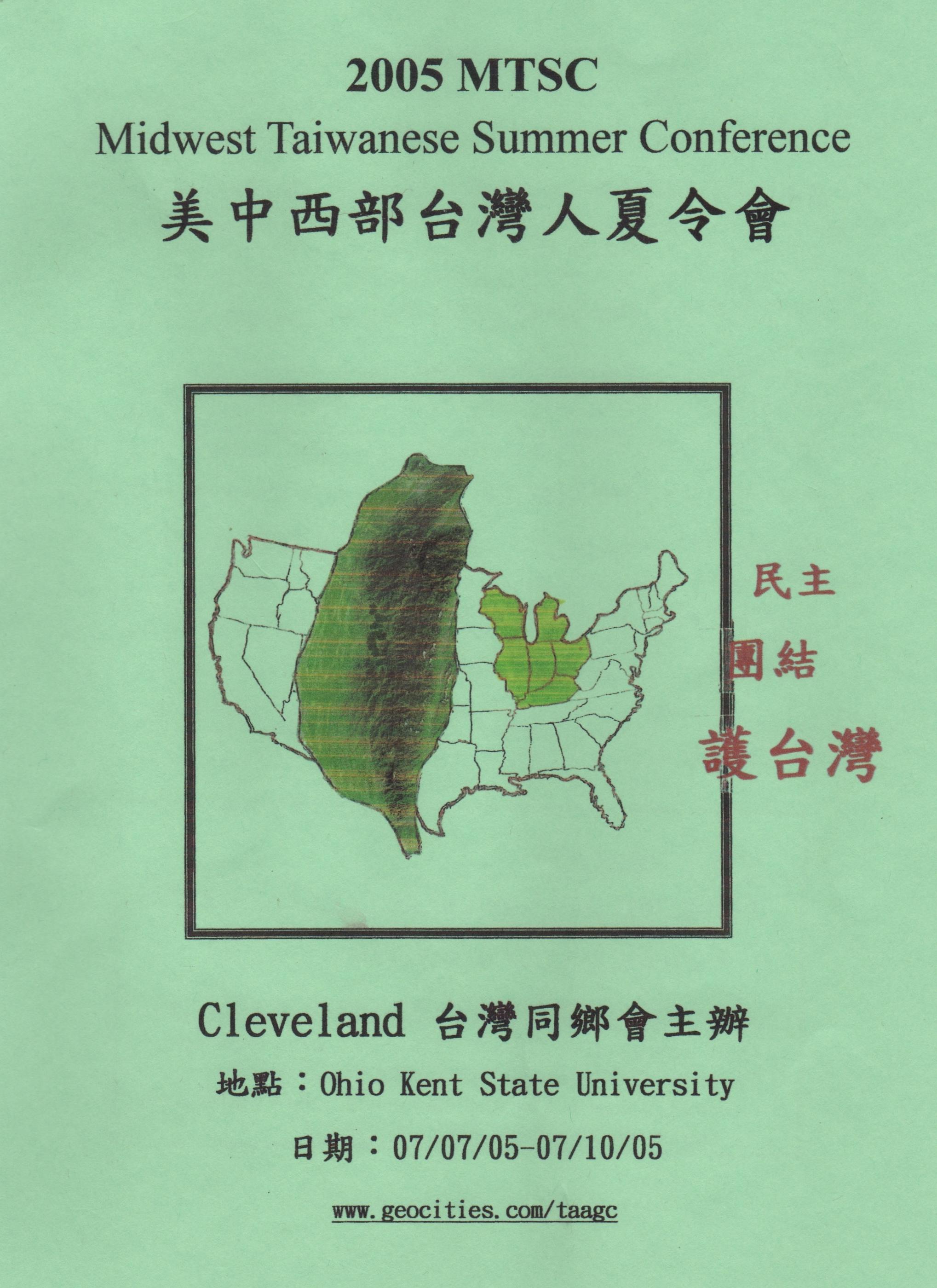 2005-MTSC籌備委員會,選訂今年主題為“民主,團結,護臺灣”。場地也選在交通方便的Ohio Kent State University。特請國內外頂級人物如曹長青,許世楷,陳文彥,凌子楚,盧千惠,葉明霞,李友禮,林文正等等在民權,政論,外交,生技,理財,臺美人社會 等領域來作專題演講(尙有多人未及登上)。另外我們也請到一位很特殊的,很臺灣的美國牧師,他講一口非常流麗的,道地的臺灣話,相信90%的臺灣人無法用臺灣話難倒他,他將用臺灣話來演講,來爲全臺灣國人禱吿祈福,希望大家不要失去了“聽阿督(突鼻子)仔講臺灣話”的機會。尙有件不能不提的事,我們的“認親結緣”會夜夜登場,有讓人流口水的家鄕味,也有冒氣的BEER,可使您飽又醉不忍入睡。