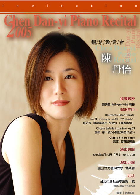 陳丹怡曾與台北愛樂合唱團,台大合唱團等演出團體,嘗試各種不同類型的演出,皆獲得相當的好評與迴響。2007年春天首度於國家演奏廳舉行的鋼琴獨 奏會,展現出高超的技巧與豐富的內涵。面對這位年輕又有 Camera Face 的女鋼琴家,筆者實在忍不住一向的好奇,就問 “能否請妳談談,一路走來在妳學琴的過程中,哪一位老師對妳的影響最大?”丹怡以充滿感激的神情述說著 “啊!我主修鋼琴的德國人教授魏樂富,以及他的夫人葉綠娜女士,對我的影響最大,他們栽培我,常常鼓勵我,並邀請我與他們同台作三鋼琴演奏,另外,他們還 邀請我同台演出 “鋼琴劇場”給我印象深刻又很特殊的經驗”, 她接著說“魏教授不只言教,還以身作則,我常常看到他在教課前後自己坐在鋼琴前不停的彈奏,這感人的局面常激勵著我也要像他那樣,他已經是一個非常受尊 敬、肯定的鋼琴家還是那麼的敬業,勤奮不懈。”她又補充說: “葉綠娜教授也有一句名言讓我終生受用無窮,她說 “你沒有練好?就不要睡覺啊!”我後來教學生也常引用這句話。”誰說一定要出國留學才能學有精專?台灣國內也有很優秀的教授、一樣能教出國際級、很優秀的 學生,他們不就是很好的例証嗎?