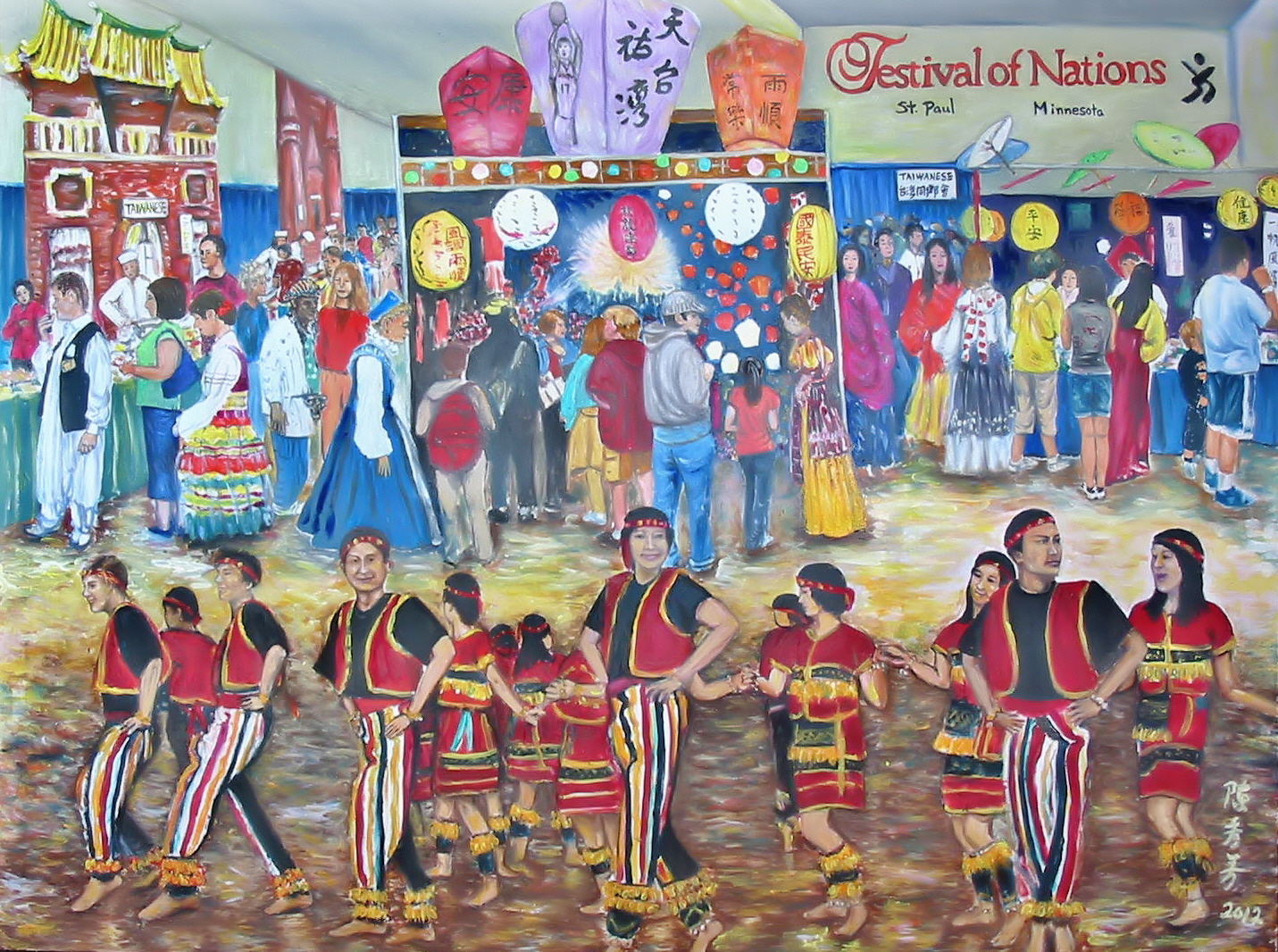 自1979年,明州(Minnesota)台灣同鄉會每年參加當地的萬國節。除了販賣食物、禮品及跳舞外,我們放很多心力在文化展覽,為了對每年來 參觀的十萬美國人介紹台灣文化。自從1987年以來,台灣幾乎每年都得到優勝獎。本來大家只用傳統服飾、手工藝品或印一些海報來佈置攤位。我們台灣團隊, 不但早早就開會討論、計劃、大興土木 ,我也開始用油畫,配合大會主題,來介紹我們文化。我想,雖然我畫得不夠好,在沒有其他比較下,沒有人會對我苛求。尤其我畫得很大,有十呎寬八呎高,至少 也會引人注意。我得到四天免費的展覽場地,也增加我練習的機會。結果,萬國節的主辦人多次感謝台灣同鄉會,認為我們提高了整個文化展覽的水準。這不就是我 們台灣人極力要爭取的嗎?