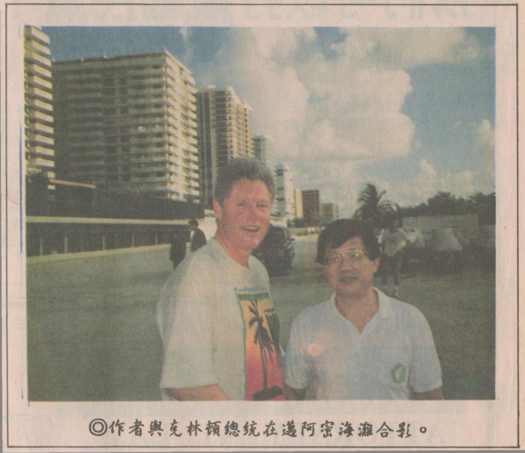 上午十一時正在同一旅館有一個會議“Summit of The Americas”(美洲高層會議〉,是由中南美洲的代表參加會談,佛州州長Lawton Chiles,副州長Baddy McKay,參議員Bob Graham,衆議員Clay Shaw, Lincoln Diaz-Balart, Carrie Meek, Corrine Brown,還有加州來的Esteban Torres衆議員,前衆議員D. Fascell及其他許多貴賓如Bob Butterworth, T. Gallagher等都來參加。總統是主講人,講完後下來跟聽衆握手,我因坐在貴賓席跟Deutsch在一起,所以有機會上去跟總統握手,還把一封準備的信交給他,信是由FAPA(台灣人公共事務會)總部準備,要求總統支持台灣進入聯合國及請他注意我們台美人護照出生地被塡寫成「中國」而不是「台灣」之事。