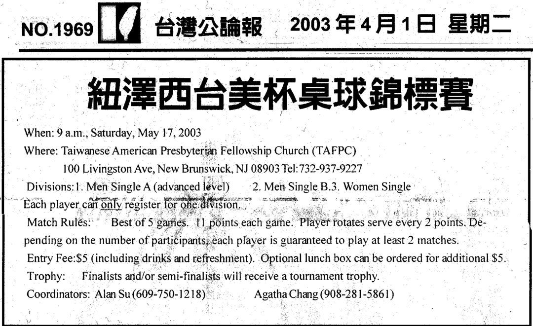 紐澤西台美杯桌球錦標賽 March 5, 2018 Admin1 13. Athletic Activities Source from Taiwan Tribune #1969, 04/01/2003 Posted in 03/2018