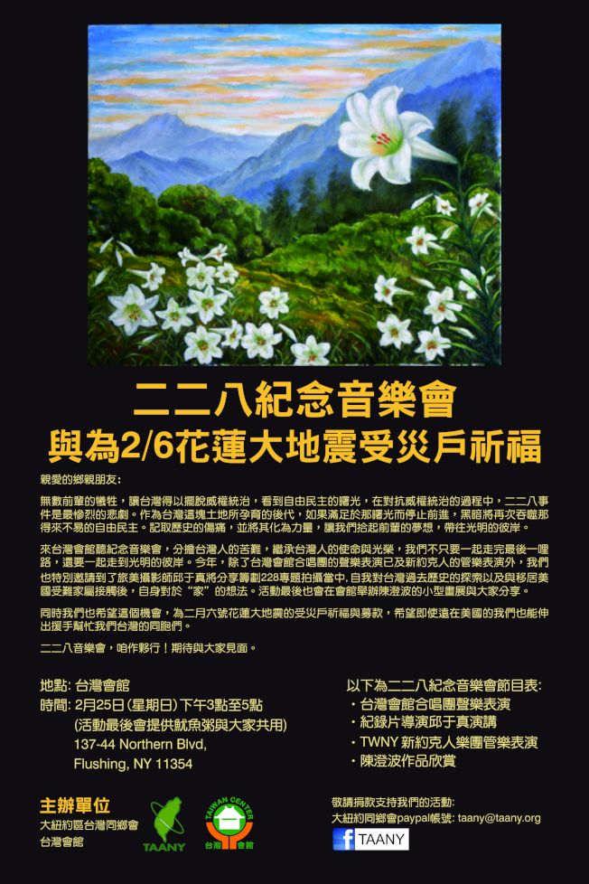 [大紐約區台灣同鄉會] 二二八紀念音樂會 & 為2/6花蓮大地震受災戶祈福