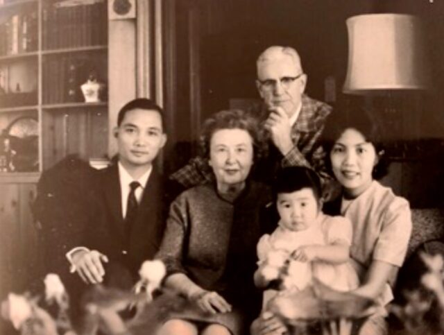Not long after the Yings’ wedding, they learned they were expecting a child. Their apartment was near campus in a small shopping area known as Dinky Town. Their baby girl, Evelyn, arrived in May 1960. (See Ph-1, Dr. & Mrs. Barr with Yings).