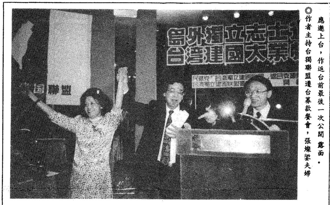 然而,惡勢力絶不可能永遠横行,台灣的政治局勢隨著咱們海外台灣人四十年來前仆後繼的犧牲、努力,也隨著世界民主、獨立浪潮而改變。一批批的有志之士,或是「翻牆」,或是「硬闖」,或是透過其他各種管道回去了。連最令國民黨深惡痛絶的「台獨聯盟」也正式宣佈要於今年遷台了,這種氣勢,又豈是當年老蔣與小蔣所能想像得到的。