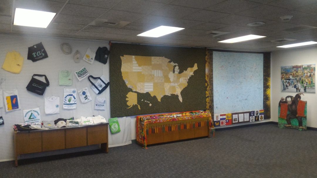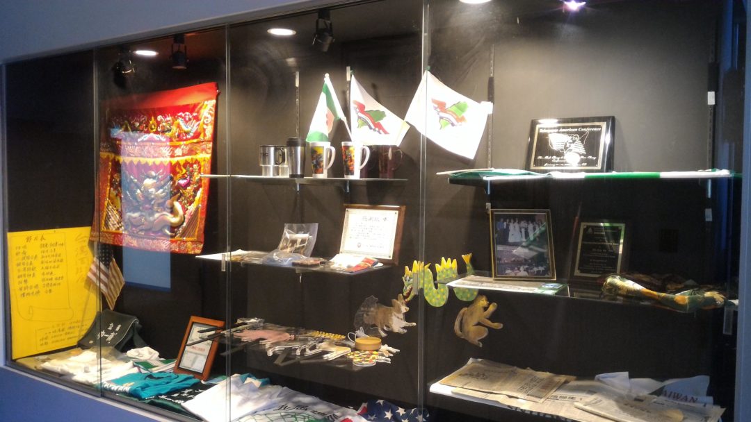 Library 5: Display T-shirts and Other Objects of Events by Taiwanese American Organizations(圖書室5:陳列台美團體的T-shirts和參與各地文化節活動的物件。)
