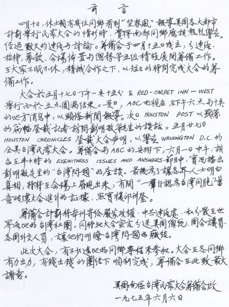 美總統福特今秋的訪問中國以及蔣介石的死亡,叫醒了無數沈默的台灣人。St. Louis, Chicago, Toronto, Los Angeles, 以及San Francisco均先後圓满地舉辦空前盛大的“台灣民衆大會”。“獨立”、“自主”的正義之聲,此呼彼應。台灣人不再沈默,台灣人不再懦弱。曾是“望春風”發行地之一的休士頓也不甘落後,五月十七日由Georgia, Louisiana, 以及德州各地來的同鄕在Houston Red Carpet Inn – West,成功地擧辦了美國南區首次“台灣民衆大會”。大會中,並預祝五月廿七日卽將在華府所舉辦的“全美台灣民衆大會”的成功。並將此股海外的呼聲,帶人島內,激起全民運動,逼使嚴政權接受台灣人民鄭重的要求。