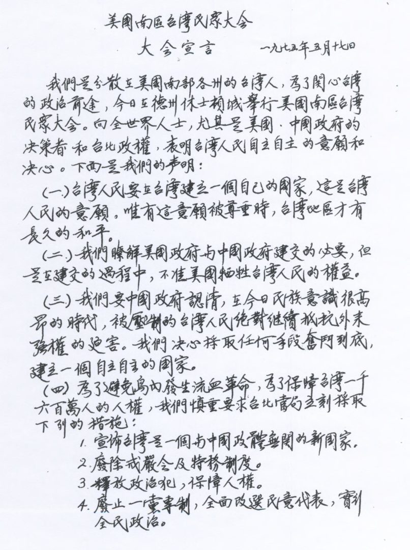 聽完“史詩”後,大家心中都有很深的感觸。接着是大會主席致歡迎詞並說明召開大會的目的,司儀朗誦世界各地台灣人圑體的賀電。陳錦芳的世界台灣同鄕會簡介、台灣人民自決運動代表魏瑞明、休士頓台灣同鄉會會長林振榮,台灣獨立聯盟主席張燦鍙及台灣研究所所長彭明敏的演講都博得了不少的掌聲。緊接著“自由發問”,“討論與建議”,最後由大會主席宣讀“大會宣言”,問全世界人士,尤其是美國、中國的決策者和台北政權”表明台灣人自主的意願和決心,並愼重要求台北當局立刻採取下列的措施: