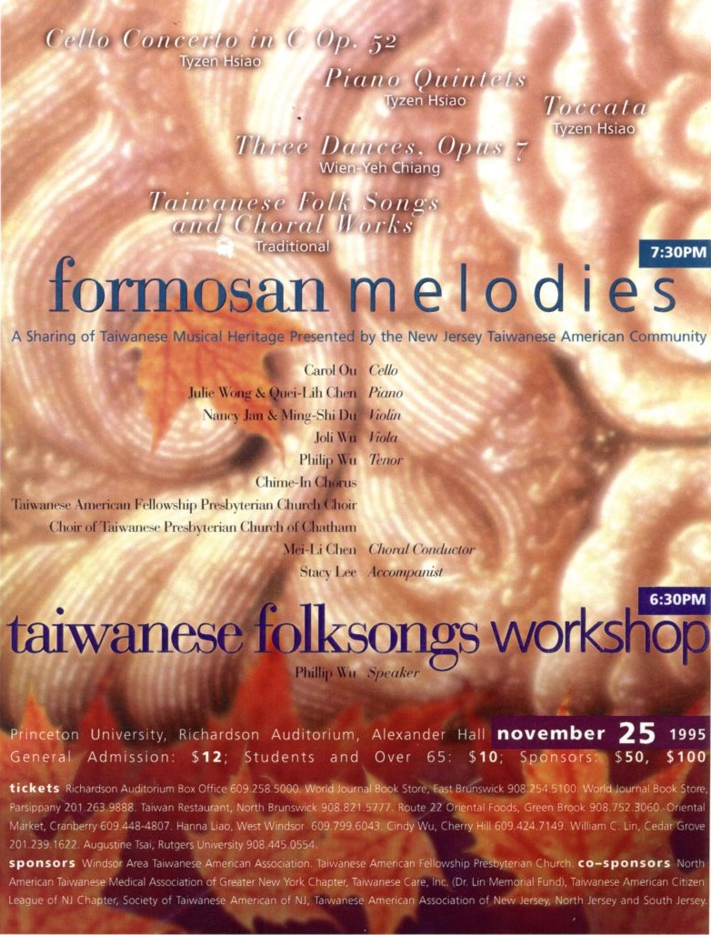 紐澤西中部台美人的合唱團名為「拾音合唱團」,會員在三十至四十人左右,大家都覺得台灣歌曲實在非常優美,有高水準,應該要進一步介紹給主流美國社會,於是開始籌劃這個「音樂會」。經過兩年多的努力,終於借到Princeton 大學的 Richardson Auditorium音樂廳。這所古音古色的音樂廳可以容納五百人,在這裏曾經舉行過很多大型、有名的音樂會,因為音響設備良好,氣氛雅典,非常受歡迎,場所租借金相當昂貴,還要等待一段很長的時間。我們耐心等著,終於被排進「感恩節」那個星期,日期訂在11/25/1995。除租金以外,有音樂家的聘請費、公關費、及多種的雜費,全部的費用很多,所以我們很大膽決定賣門票來支付大部分的經費,全票12元優待票10元,贊助票50元和100元。