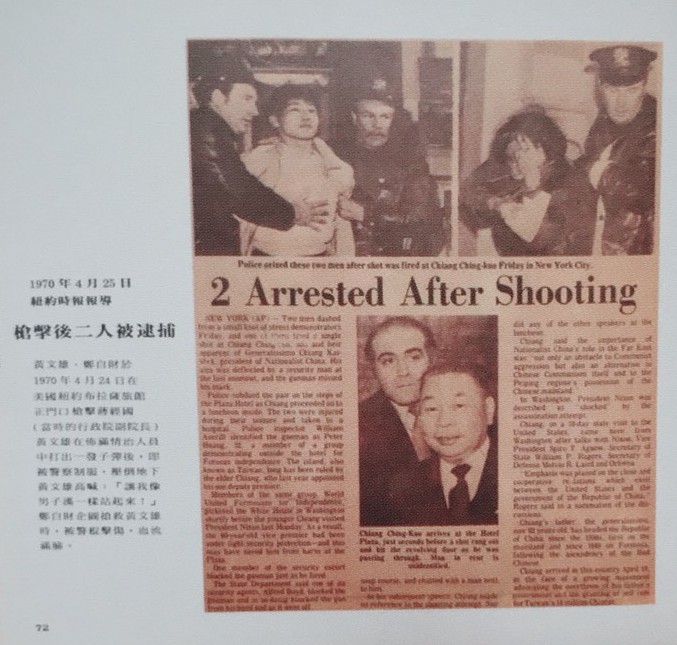當蔣經國從座車出來時,身旁圍繞著大批的美國紐約市、紐約州、聯邦政府警察以及蔣經國的隨身侍衛,黃文雄乘機混入安全人員之中。黃文雄距離蔣經國很近,差不多有五、六公尺,我離得比較遠,在安全人員外圍,超過十公尺以上。從蔣經國下車到黃文雄對他開槍的整個過程,我並不是全部都看得很清楚,因為安全人員都圍得很緊密,所以看不到,只看到蔣經國將要走進飯店,當他走進人群之後就看不到了。
