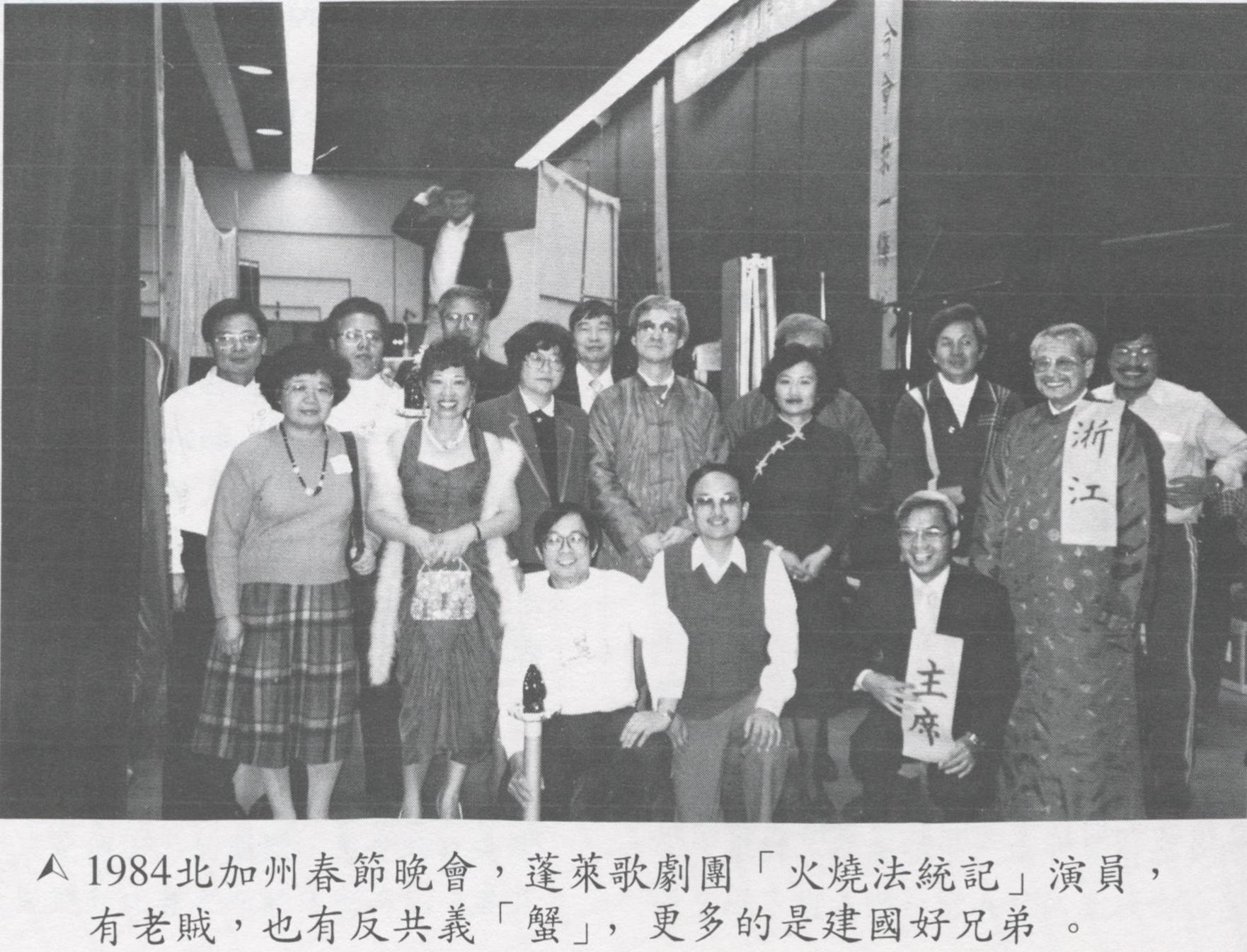 一九八四,連日昌兄當會長的那一年,不知他是那一條筋觸電,竟找上我家許英雁當總幹事。享受了幾年別人為我們幹事,也應輪到我們為別人幹點事了,不想一幹,竟要「總幹」起來。許兄雖然沒有自己「總幹事」(眞正的大事都由有經驗的人去幹了,因為大家都有團隊精神),但他確實認眞、負貴的幹起事了。想想大事都由別人幹了,那麼就幹協志會的舊事之一一演戲吧!於是從六月開始召請對歌劇團有經驗及熱心的朋友,如洪順五、李啓和、洪慶茂、紀哲嘉、黃景生及會長連日昌來家裡開會,討論要演些什麼?結果決定照往年一樣繼續「記」下去,記記我們這些人來美國留學後怎麼都不回去而留在異國的心酸内幕,故定劇名為「學留記」。本劇照常在秋季晚會演出,反應不錯,使得演員及工作人員們都很欣慰。八十年代,因故鄉的民主運動蓬勃發展,使海外一些沉默很久的同鄉漸敢活躍於同鄉會中,各地紛紛成立「台灣同鄉會」。協志會早於七三年發起成立了「北加州台灣同鄉聯合會」,每年春節有近千人參加聚會,除了聚餐、交誼外,也請海内外知名人士來演講,各地鄉會也提供精彩節目分享,蓬萊歌劇團也應邀參加演出,甚得好評。