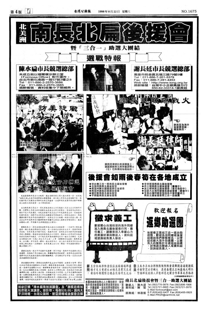 78. 北美洲南長北扁後援會 1998 March 15, 2017 Admin1 12. Political and Social Activities Related with Taiwan Source from Taiwan Tribune 台灣公論報 Issues 1675, 08/22/1998 Posted in 03/2017