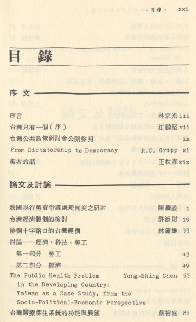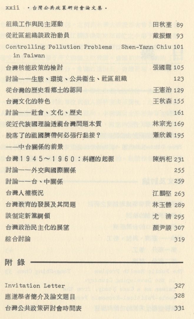 這本論文集的出版曾經許多單位與個人的協助,無法在此一一致謝。但對於下列的單位與個人要特別表示謝忱:北美洲台灣人敎授協會慈淵基金資助部分經費,李淸雲女士整理錄音並翻譯陳炳杞敎授的論文,張添財先生校對,歐惠玲女士承担中文打字,彭美智女士担任英文打字。對於林宗光與蔡明憲兩位敎授在整個出版過程中的協助與鼓勵更要深深致謝。雖然只是一本小小的論文集,編排的錯誤與不完整相信是會有的,敬請作者與讀者指正。