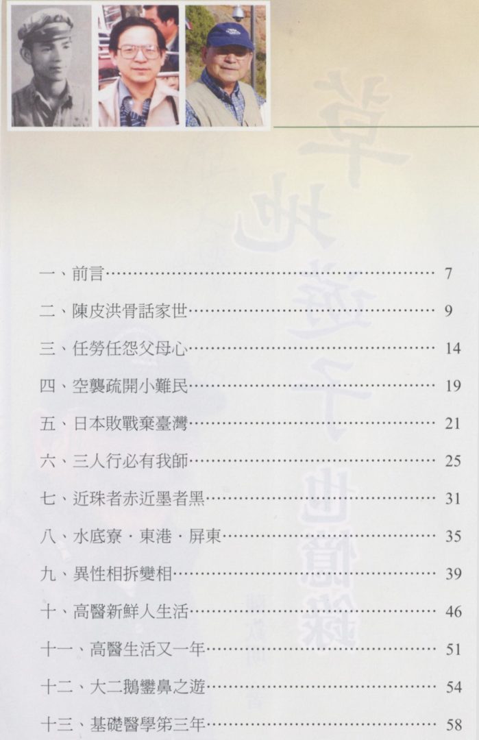 前後拜讀過高醫同學們,例如林媽利的《生命故事-風中的波斯菊》,吳運東的《醫界行腳》,施哲三《成功的人生變奏曲》和最近鄭瑞雄的《留美醫師鮭魚返鄉》一書,既敬佩又羨慕,但我既無豐功偉業或一官半職,肯定無人會代我寫書或傳記,又缺豐富文釆或生花妙筆,自己寫不出像樣文章,看來這一生休想出什麼書了,日前瑞雄兄為編輯高醫大醫五畢業五十週年紀念冊,來信邀稿,思來想去,翻腸倒肚,不知如何下筆,平時拿筆除了開支票外,很少寫文章。
