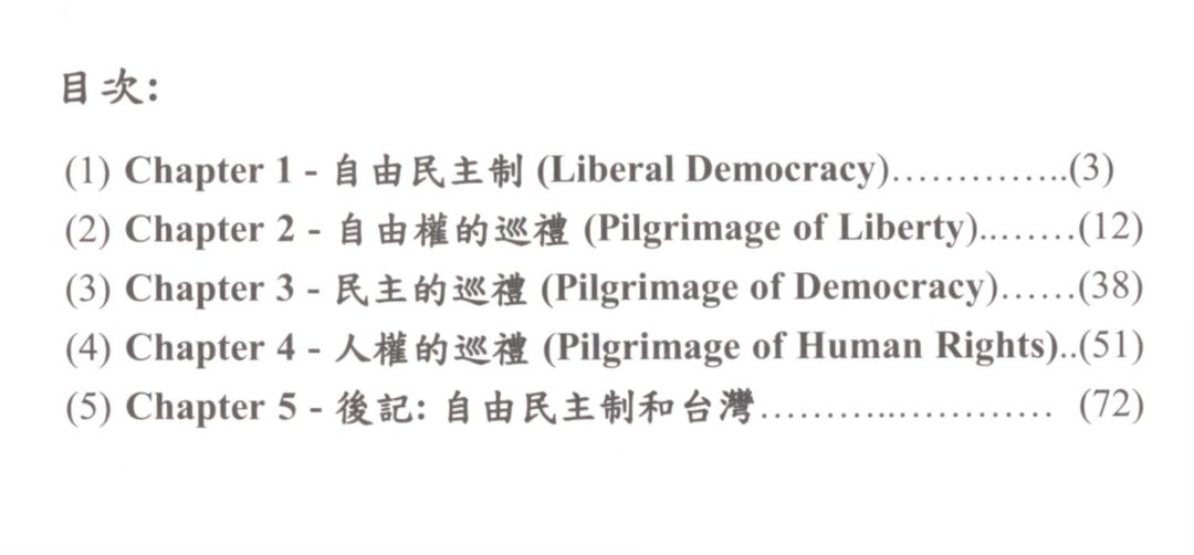 既然本冊意欲宣導自由,民主和人權的理念,表示目前台灣在這方面的狀況不理想,所以文中有依據史實而對過去和現在的當權政府作一些評論,這些批評只是作為借鏡而鑑往知來,以致力彰顯自由,民主和人權的崇高價值,本冊的主旨不在批評,冀望讀者明察.本冊將分為Liberty, Democracy和Human Rights三單元,這些理念的「道」理高達「形而上」的境界,所以本冊將以巡禮(辭海按:教徒到宗教聖地去頂禮)的心境來傳頌這些資訊.
