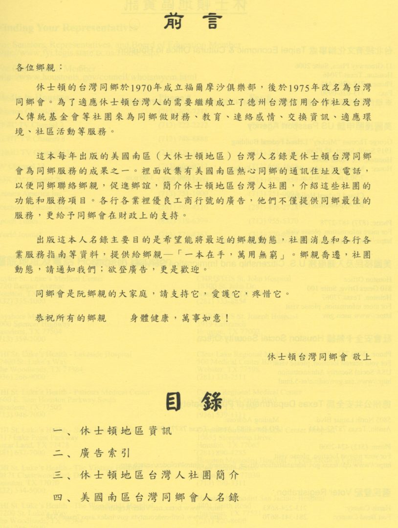 1243. 2018台灣人名錄 – 大休士頓地區及明湖城 / 休士頓台灣同鄉會 /-/2018/Magazines/雜誌 August 27, 2018 Admin1 Magazines, Publications 2018台灣人名錄 – 大休士頓地區及明湖城 編輯 休士頓台灣同鄉會 Published in -/2018 Donated by TAA/Houston Chapter 08/2018 Posted in 08/2018