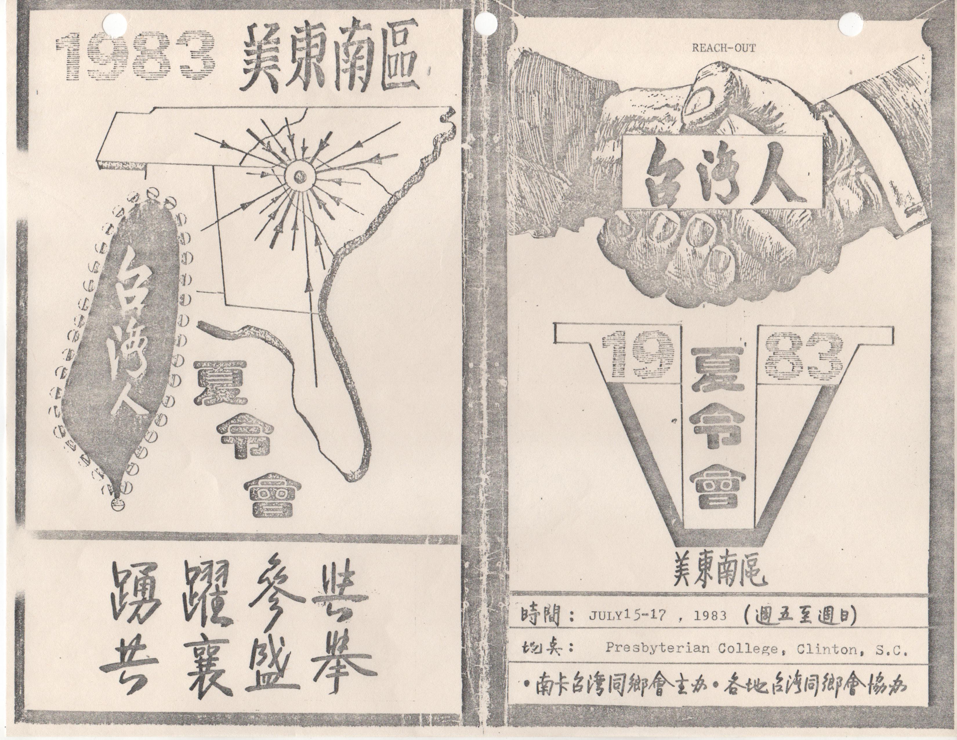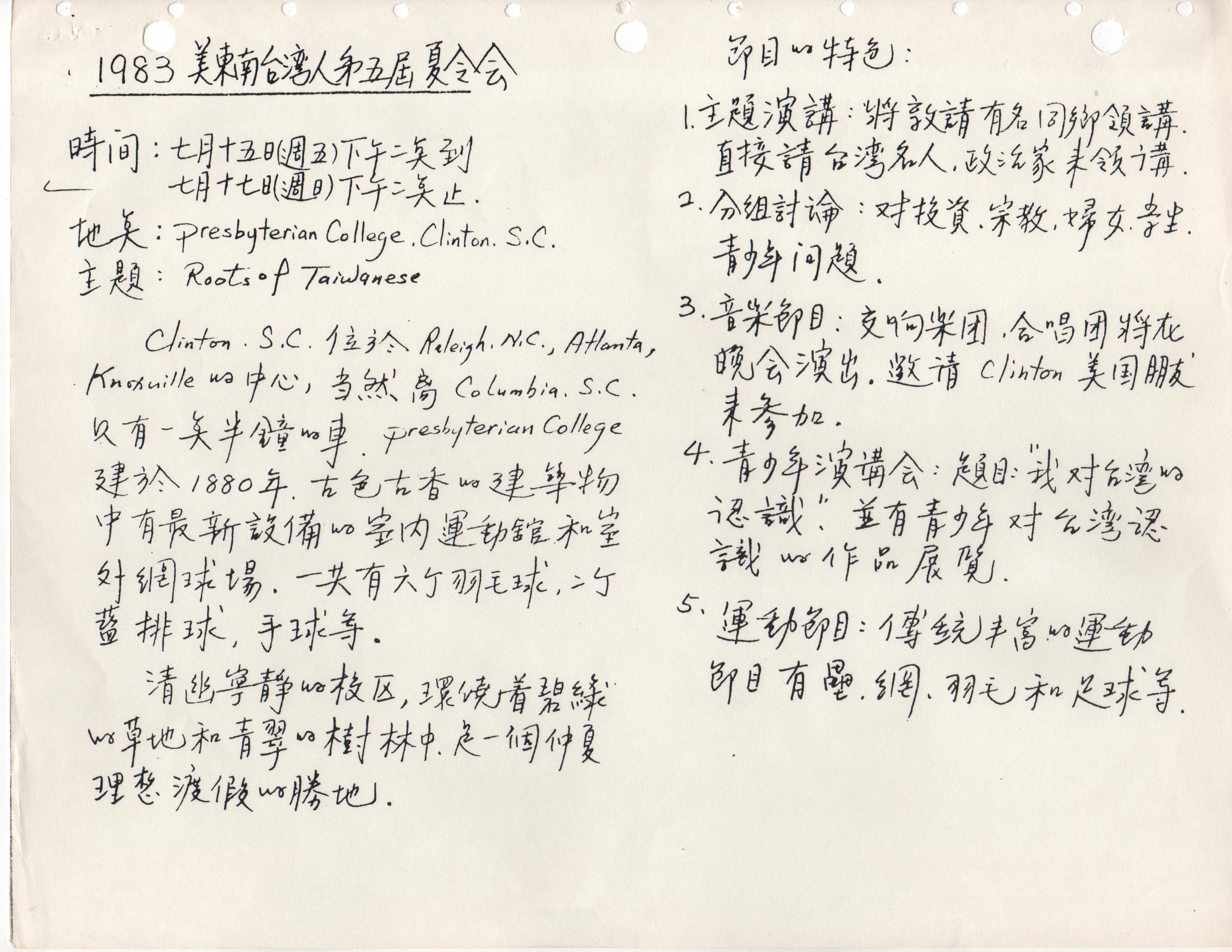 第五屆區台湾人夏令會鐵定於七月十五日(星期五)至十七日(禮拜天),在南卡羅萊娜州克林頓長老敎神學院盛大舉行。今年度該區夏令會的主題訂爲《台湾人的根》,節目據稱將比往年精彩十倍。歡迎欲往美國東南區渡假的鄕親,請儘早安排時間。據了解,南卡克林頓位於北卡羅麗市、喬治亞州亞特蘭大城和田納西州納克斯威爾等三大都市的中心,地點適中,從北卡羅麗開車約五小時,距離南卡哥倫比亞城則僅一個半小時車程°