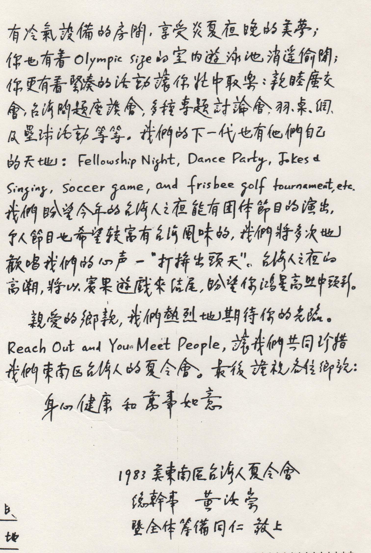 [本報綜合報導]一九八三年度美東南區台湾同鄕會夏令會擬訂於七月廿二日至廿四日,在南卡羅萊娜州Greenville Furman University 擧行。今年夏令會由南卡同鄕會主辦,美東南區各地同鄕會共同協辦,夏令會的活動除了安排各項豐富的成人活動外,另外還充實第二代子弟們的節目。