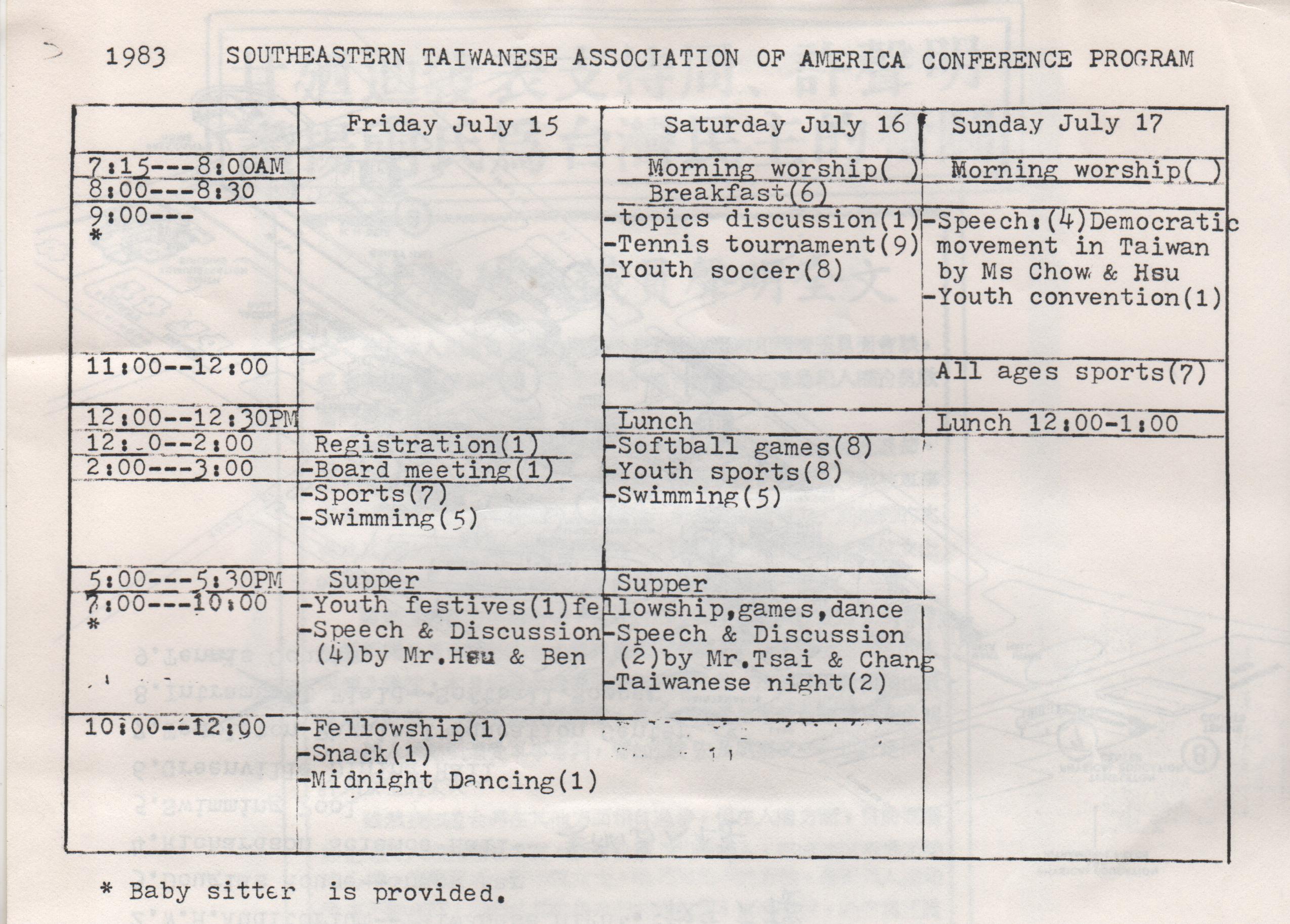 主題演講將請海外傑出同鄕或島內民主鬥士來主講;分組訂論包括投資、宗敎、婦女、學生及靑少年等問題。音樂活動方面有交響樂團、合唱團,並擬邀請克林頓地區美國朋友來參加晚會演出。靑少年演講會的題目是《我對台湾的認識 》,並展覽靑少年對台灣認識之作品。運動項目更是豐富,有壘球、網球、羽球和足球等等球類活動,並頒發優勝紀念杯。希望鄉親千萬莫錯過這項一年一度的夏令會。
