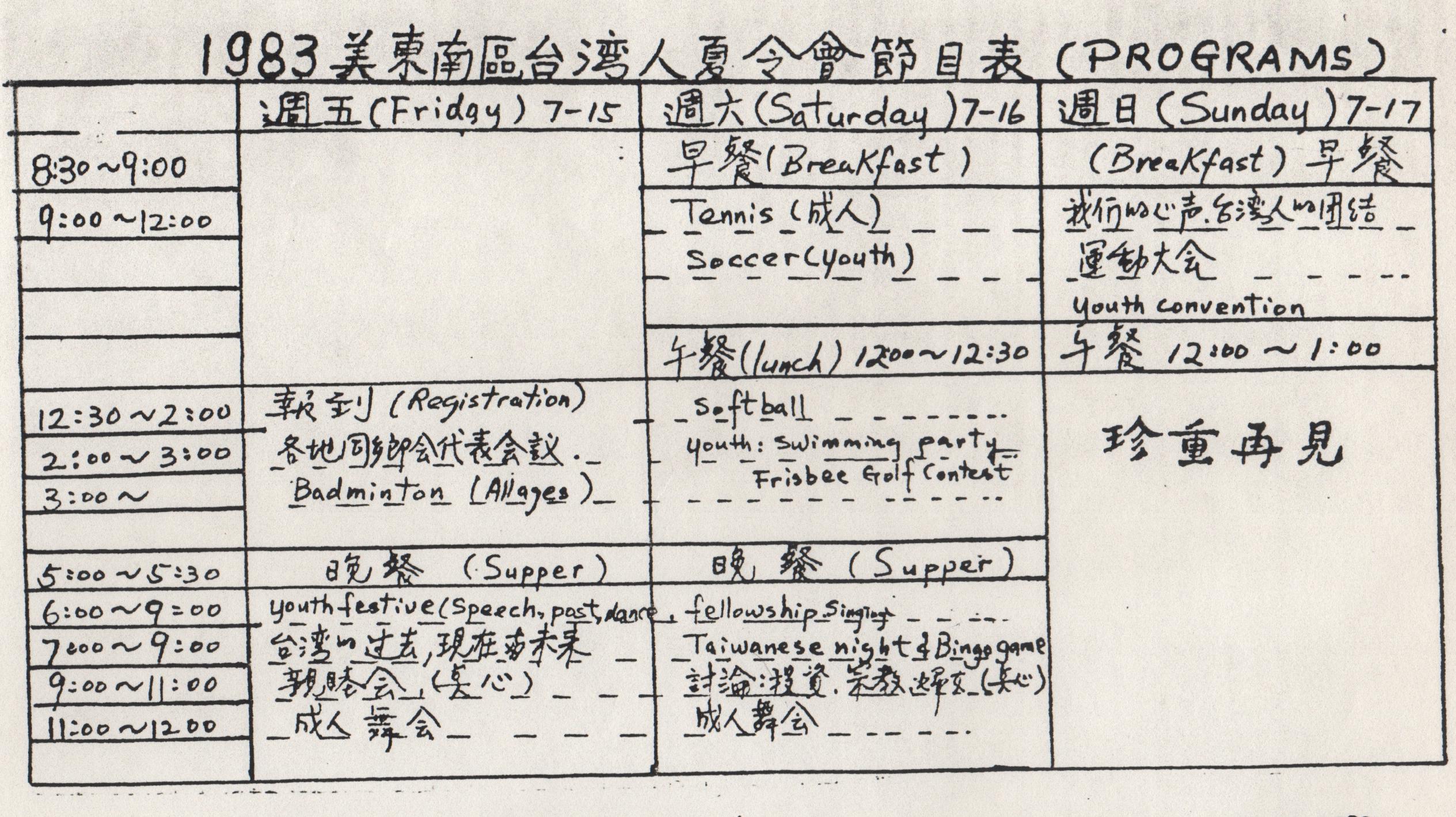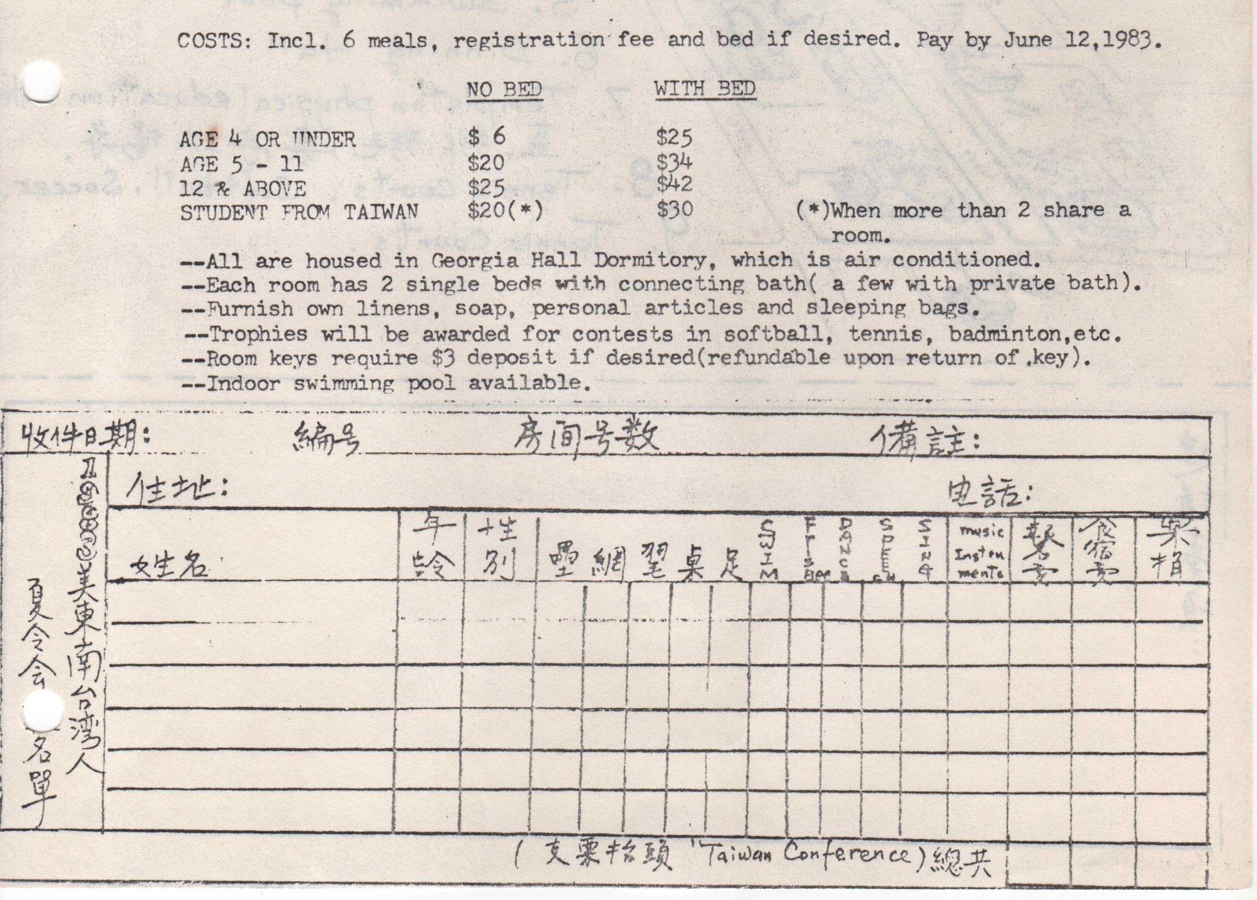 年會詳細節目表請參見附圖: 今年度夏令會報名收費標準是:四歲以下六元(無床位),有床位者廿五元;五至十一歲刵元(無床位),有床位者卅四元;十二歲 以上廿五元(無床位),有床位者四十二元;台灣留學生廿元(二人共用一室,無床位),有床位者卅元。上述費用包括六餐兩宿。需要寢室鑰匙者另邀三元保證金(歸還鑰匙時將退還)。所有寢室將集中在該校喬治亞廳宿舍,大多數寢室是兩個單人床舖,有浴室;部份寢室具備專用浴室。個人需用物品請自行攜帶。