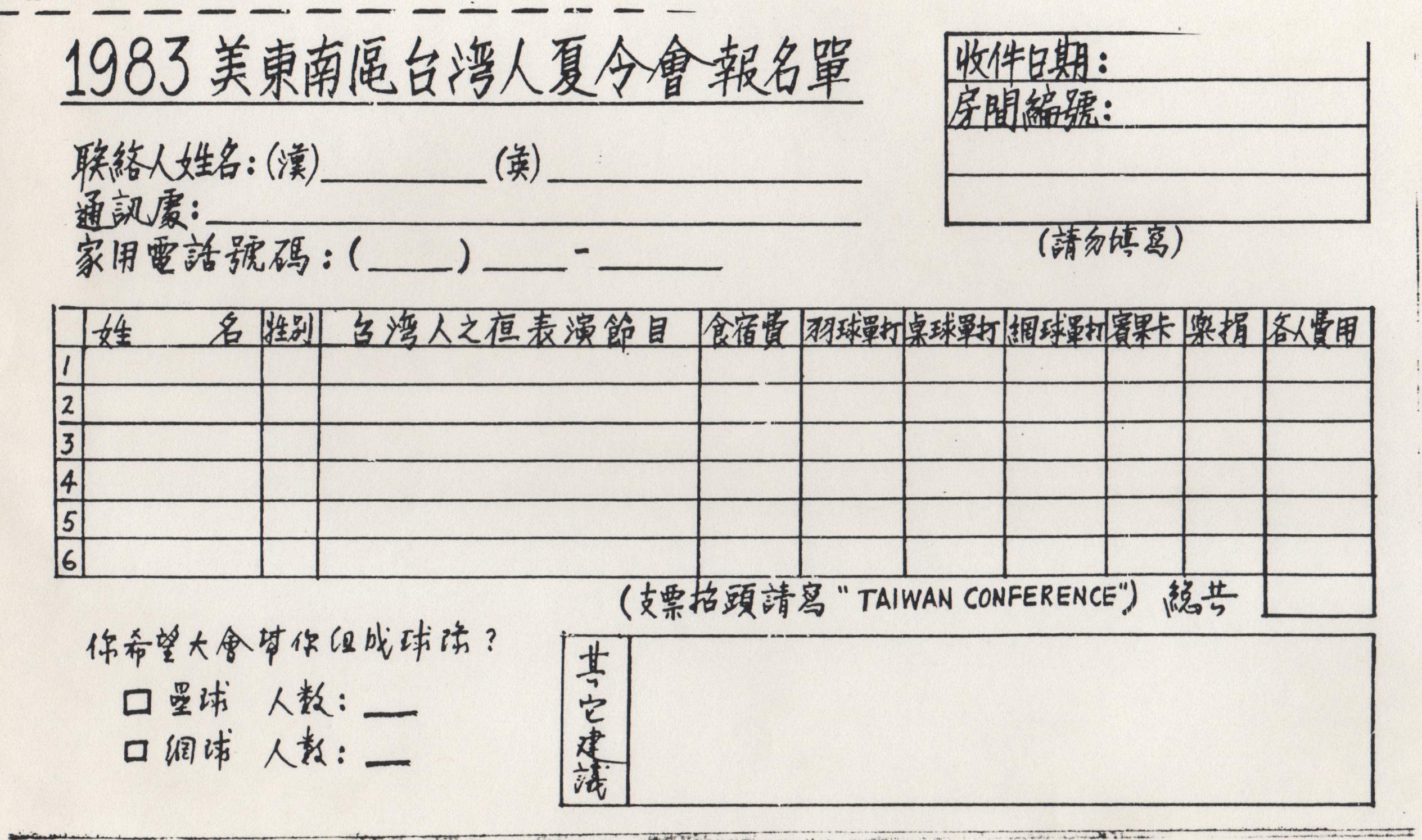報名截止日期是六月十二日,請將報名表及支票(抬頭寫Taiwan Conference)寄到:Taiwanese News ,P .O .Box 33122 ,Raleigh, N.C.27606.