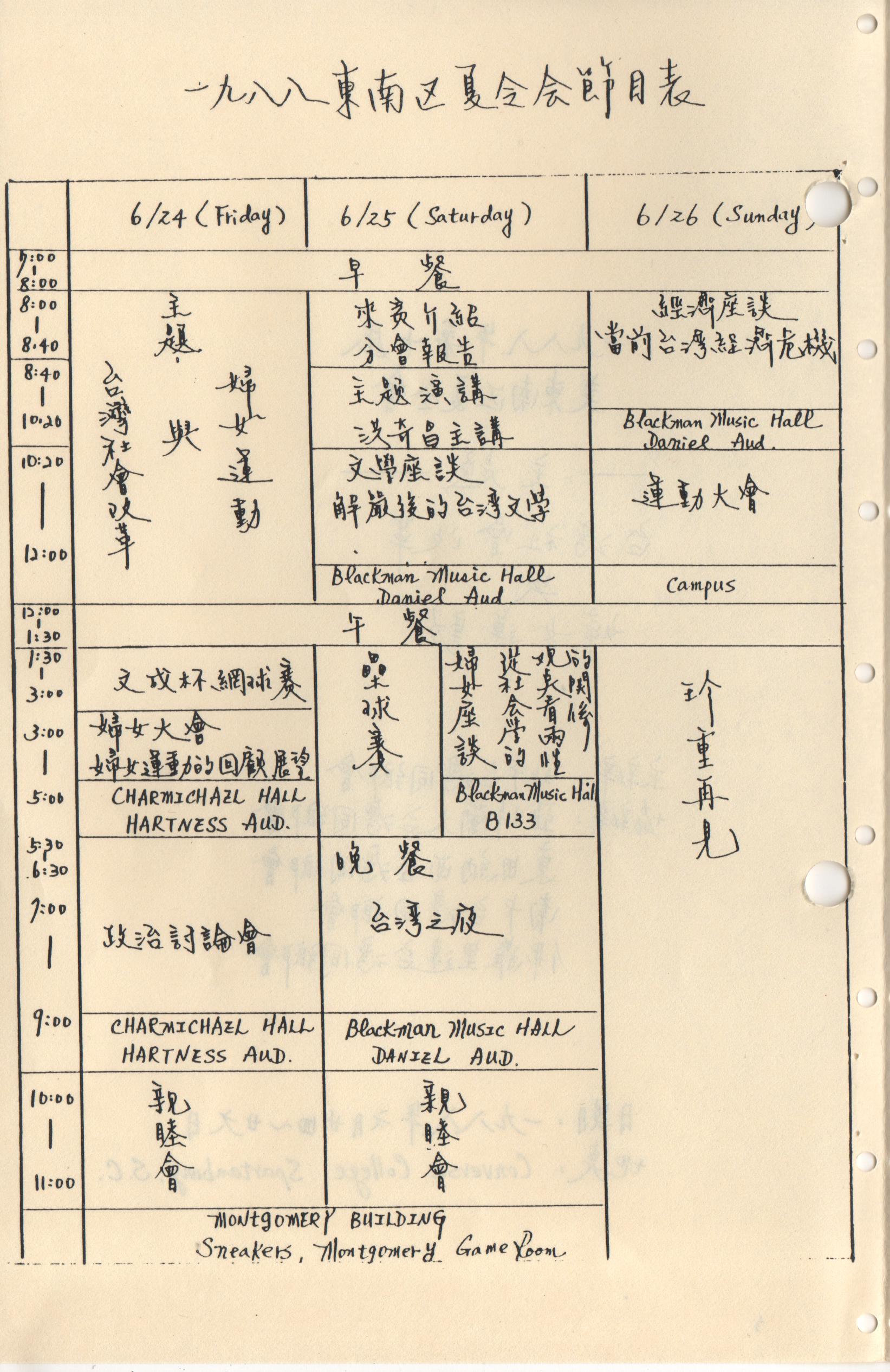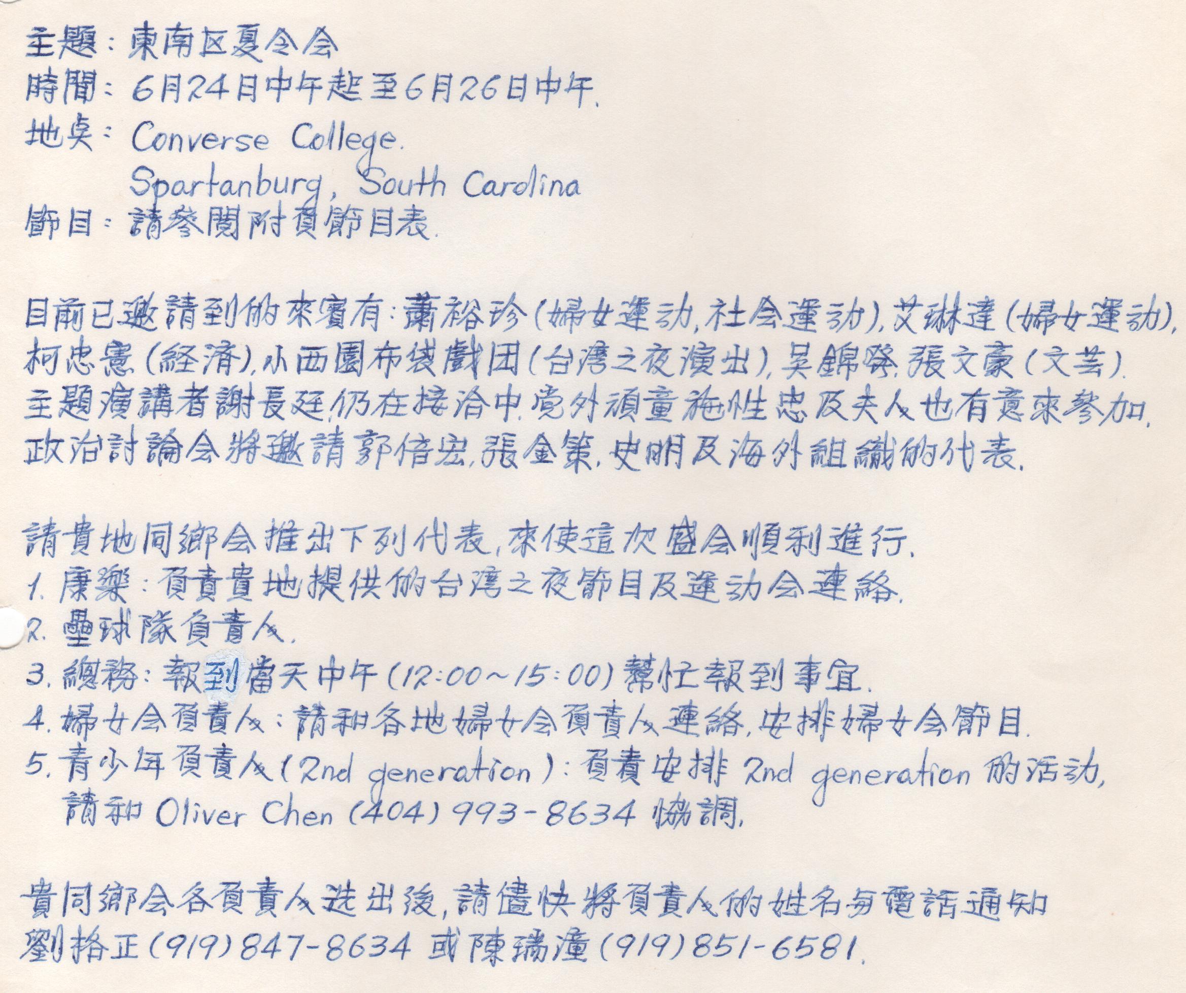 美東南各台湾同鄕會及婦女會聯合於六月廿四至廿六日,在南卡斯巴坦堡舉辦夏令會。這次夏令會之主題爲「台湾社會改革及婦女運動」。基於此主題,茲發表以下聲明: