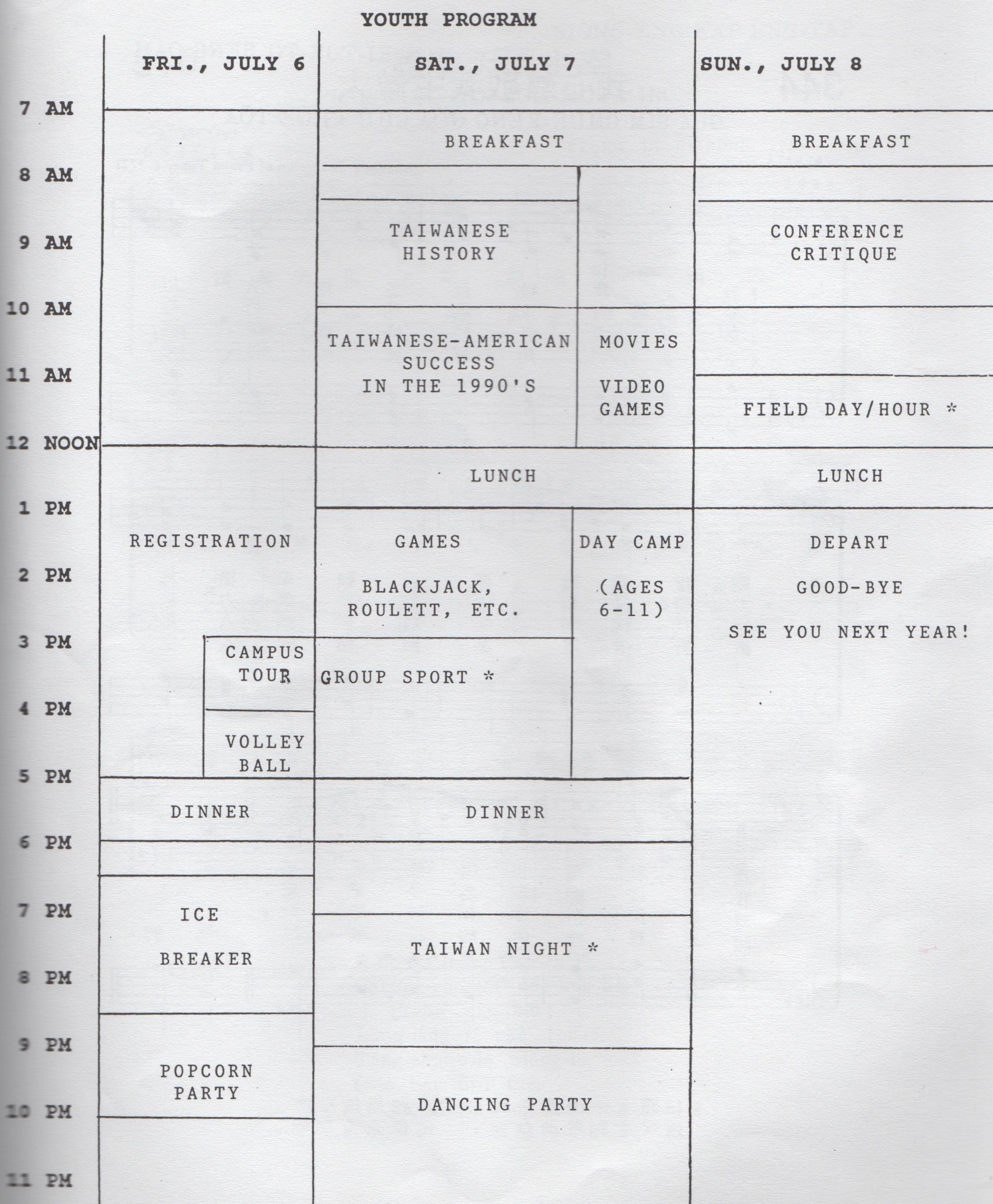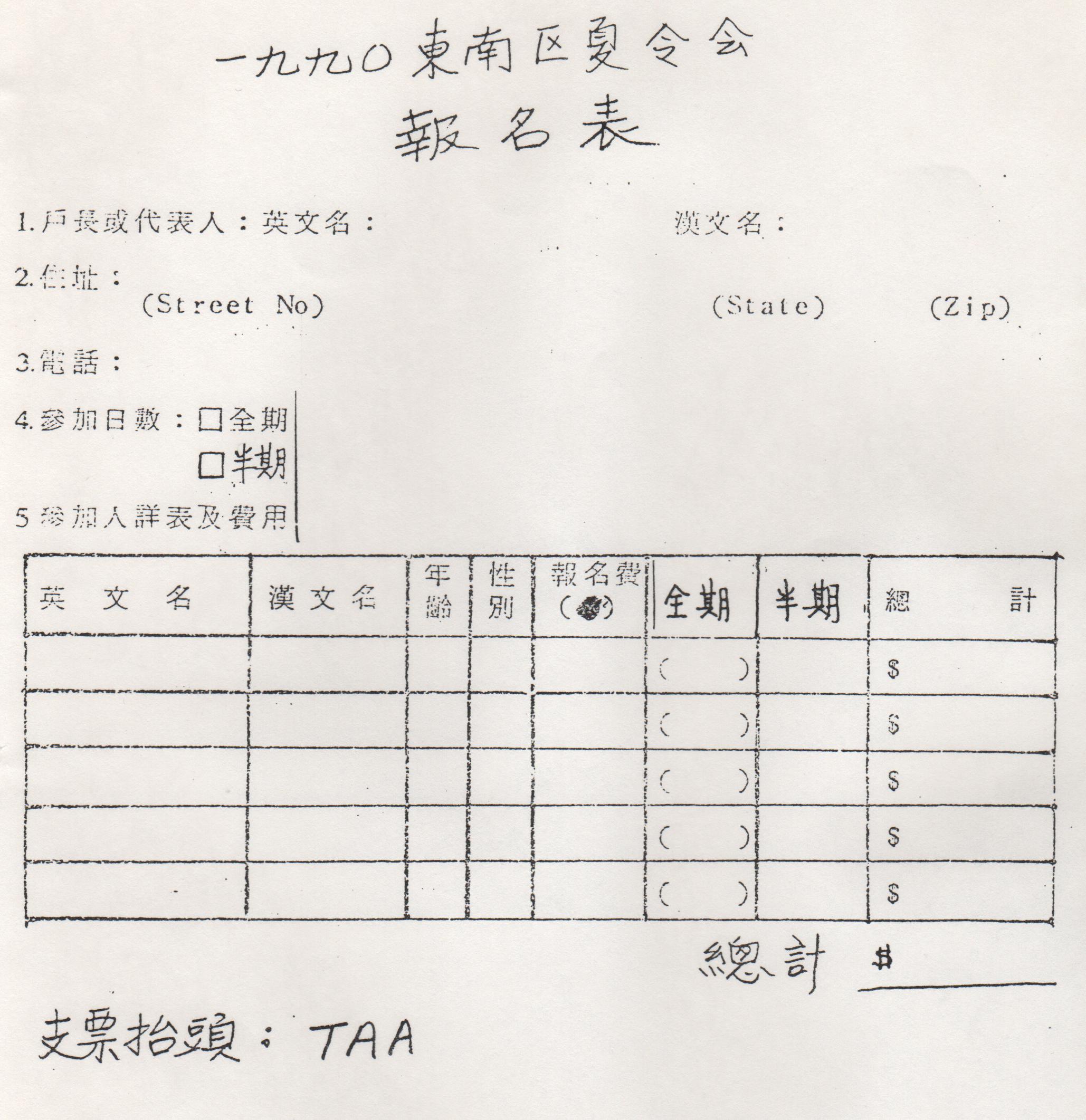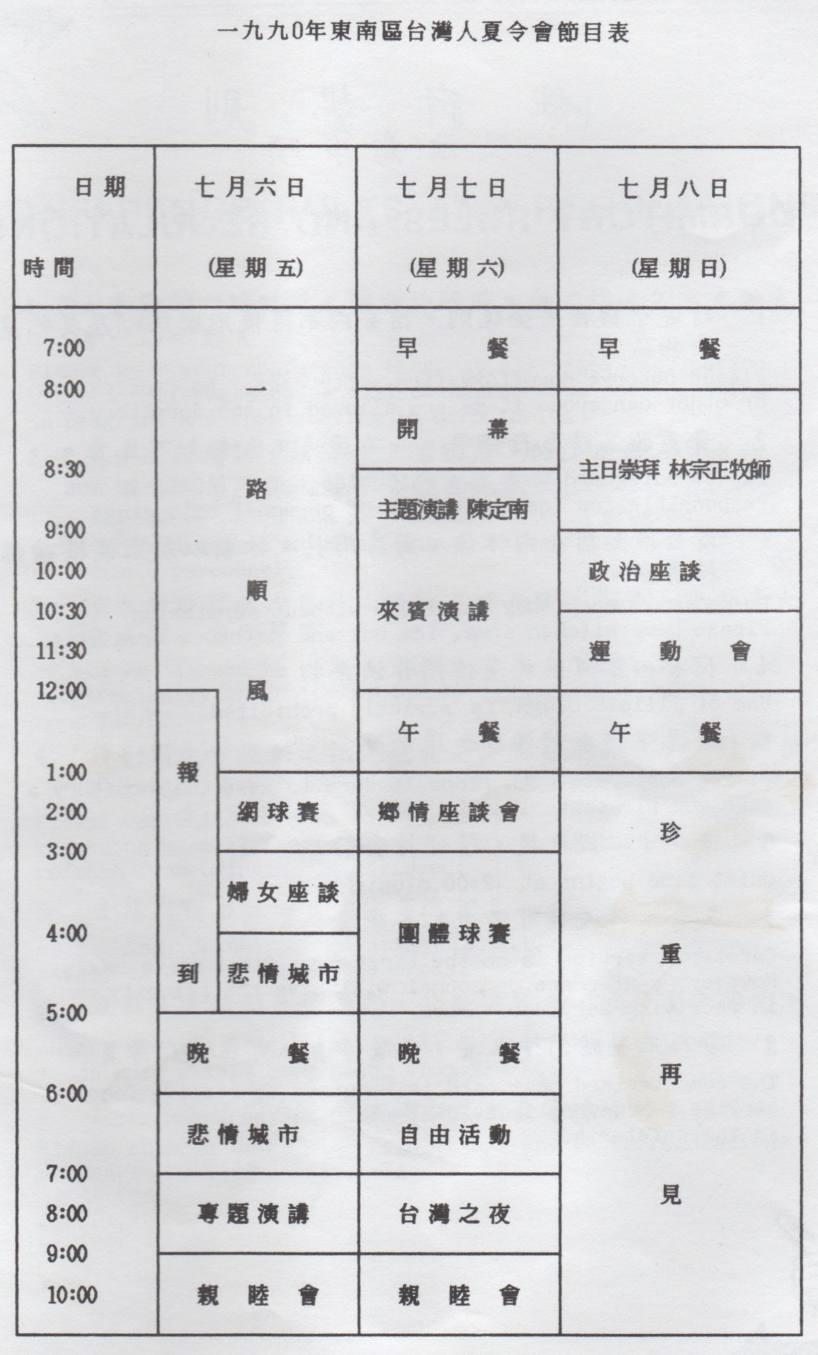一九九零年美東南區夏令會,是咱們第十二屆的夏令會,在這一支年中,夏令會逐漸的成長,茁壯。由最初的帳蓬,露營式到今天校園裏的聚會,由最初幾十人到今天幾百同郷的參與,除了許許多多同郷付出不少心血外,最主要還是大家都能愛護,肯定這完全屬於咱們的聚會,同時也請同郷們多多的呼朋引伴,一起來參加,使我們的夏令會更壯大,更活潑。