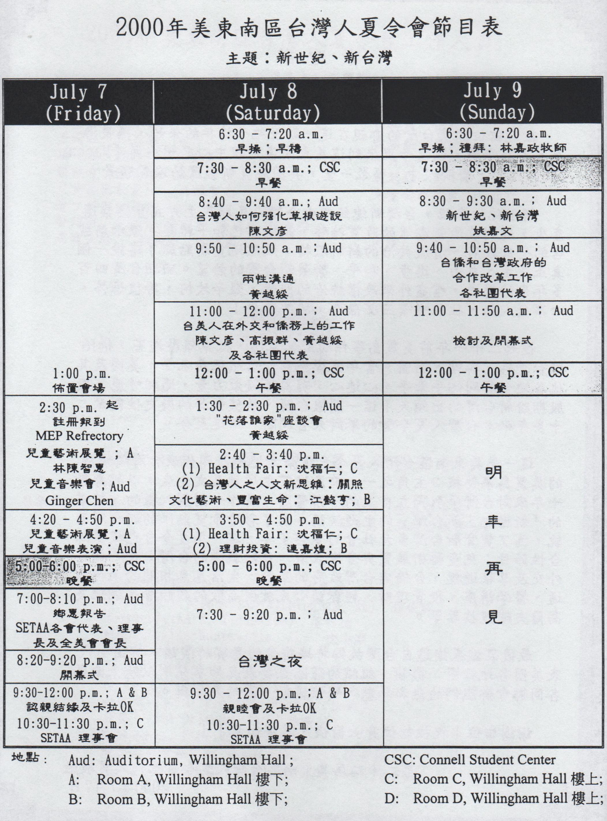 今年夏令會主題[新世紀,新台灣]。台灣人在邁入新世紀之際,以最勇敢、最堅定的選票把台灣之子陳水扁擁為台灣的新總統。特由台灣撥冗來此作為主講的總統府資政姚嘉文先生,分析新世紀,新台灣的現狀與未來。由於剛接下五十多年國民黨的老店,加上國會裡民進黨立委人數不足,新政府有不少困難,但他認為大家共同奮鬥,新政府的前途是非常明亮的。