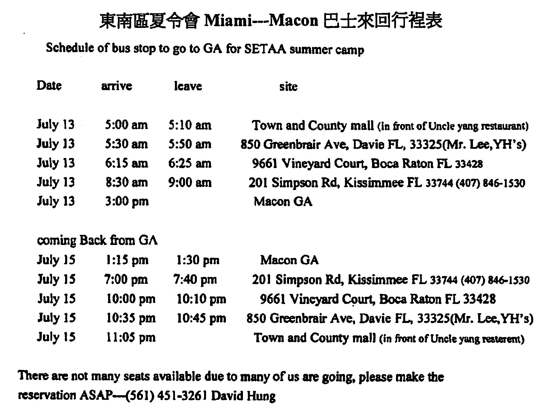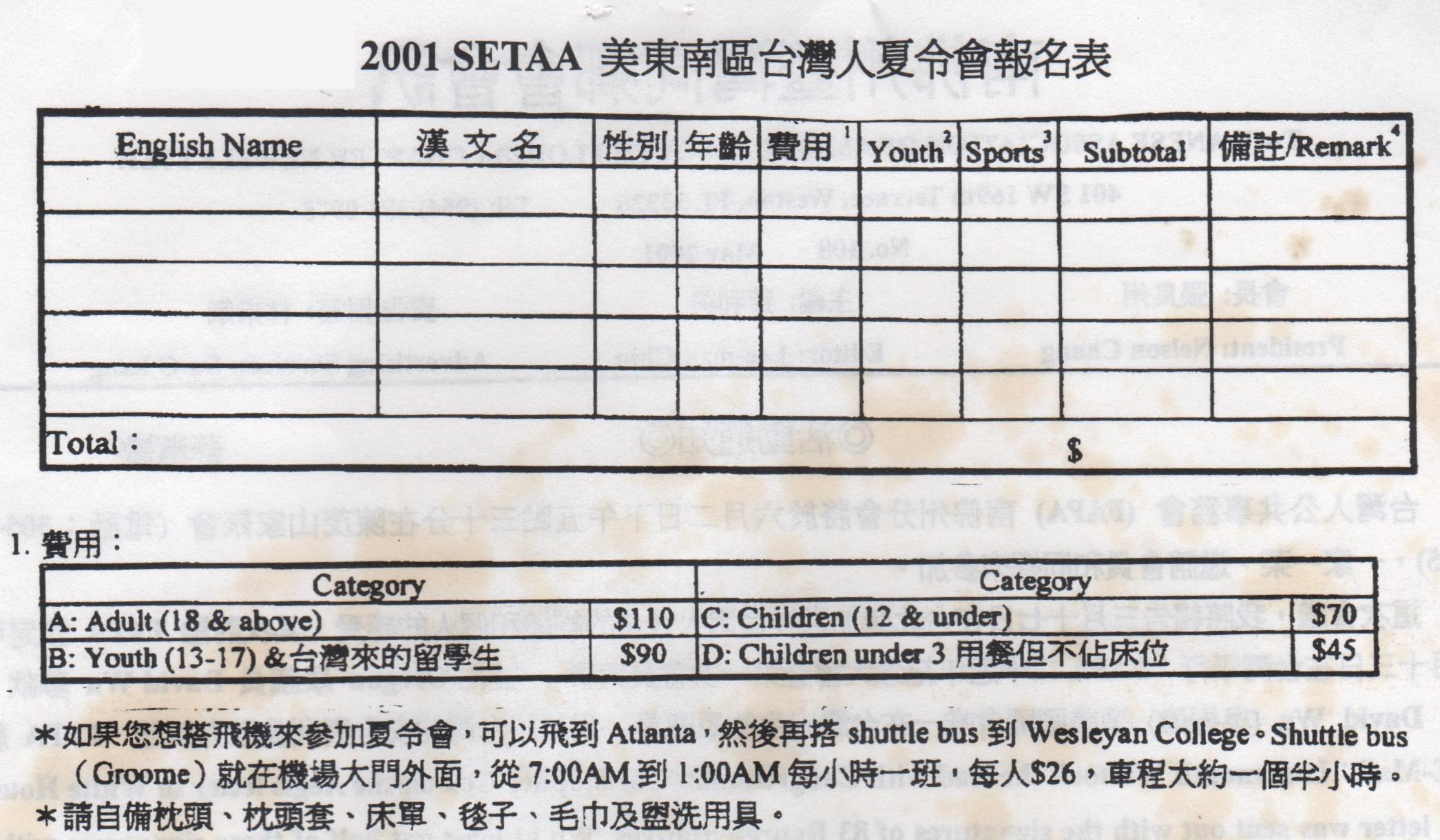 暑假轉眼即將來臨,今年的美東南區夏令會將於七月十三日至十五日在Macon, GA的Wesleyan College舉行,和去年一樣,同鄕會也將租一部bus,在七月十三日淸晨出發,參與此盛會,希望大家告訴大家,要早一點報名,爲了方便統計人數來租巴士,今年的報名表與報名費(包括三天兩夜的食、宿。支票抬頭–SETAA)請寄至: