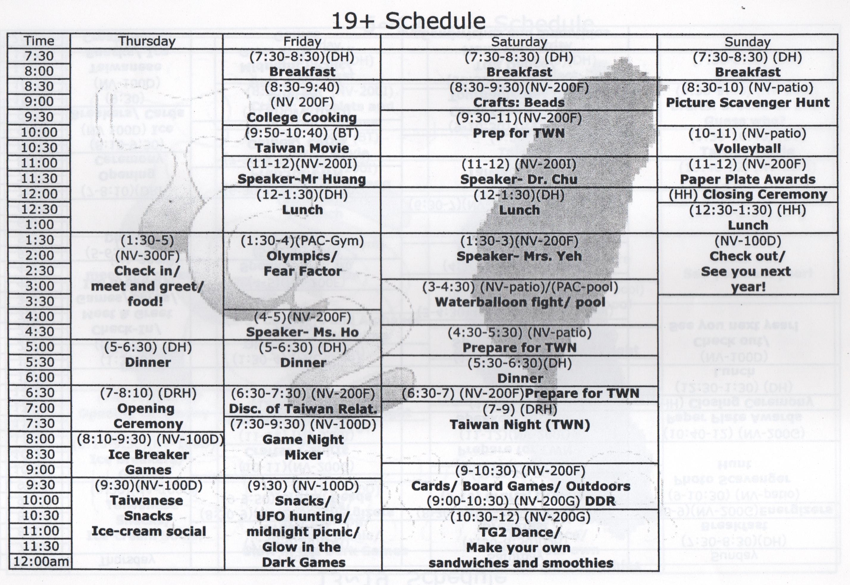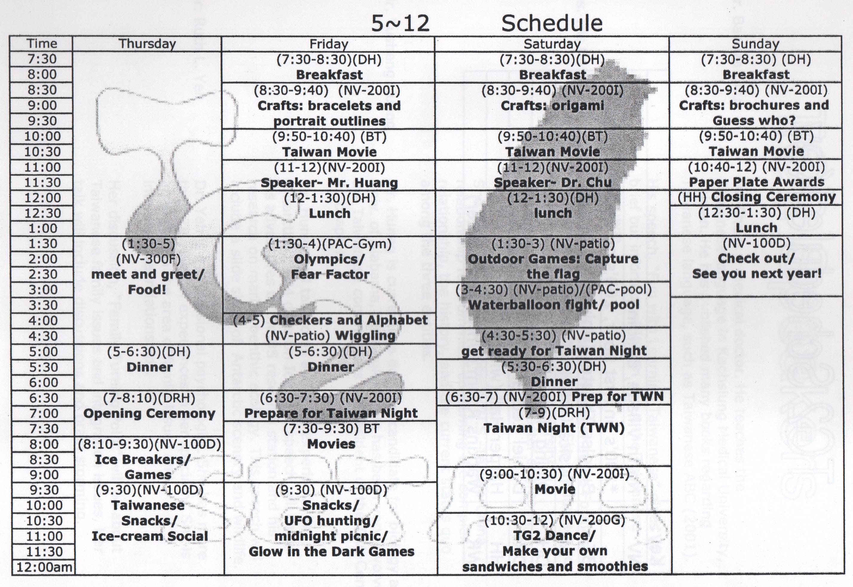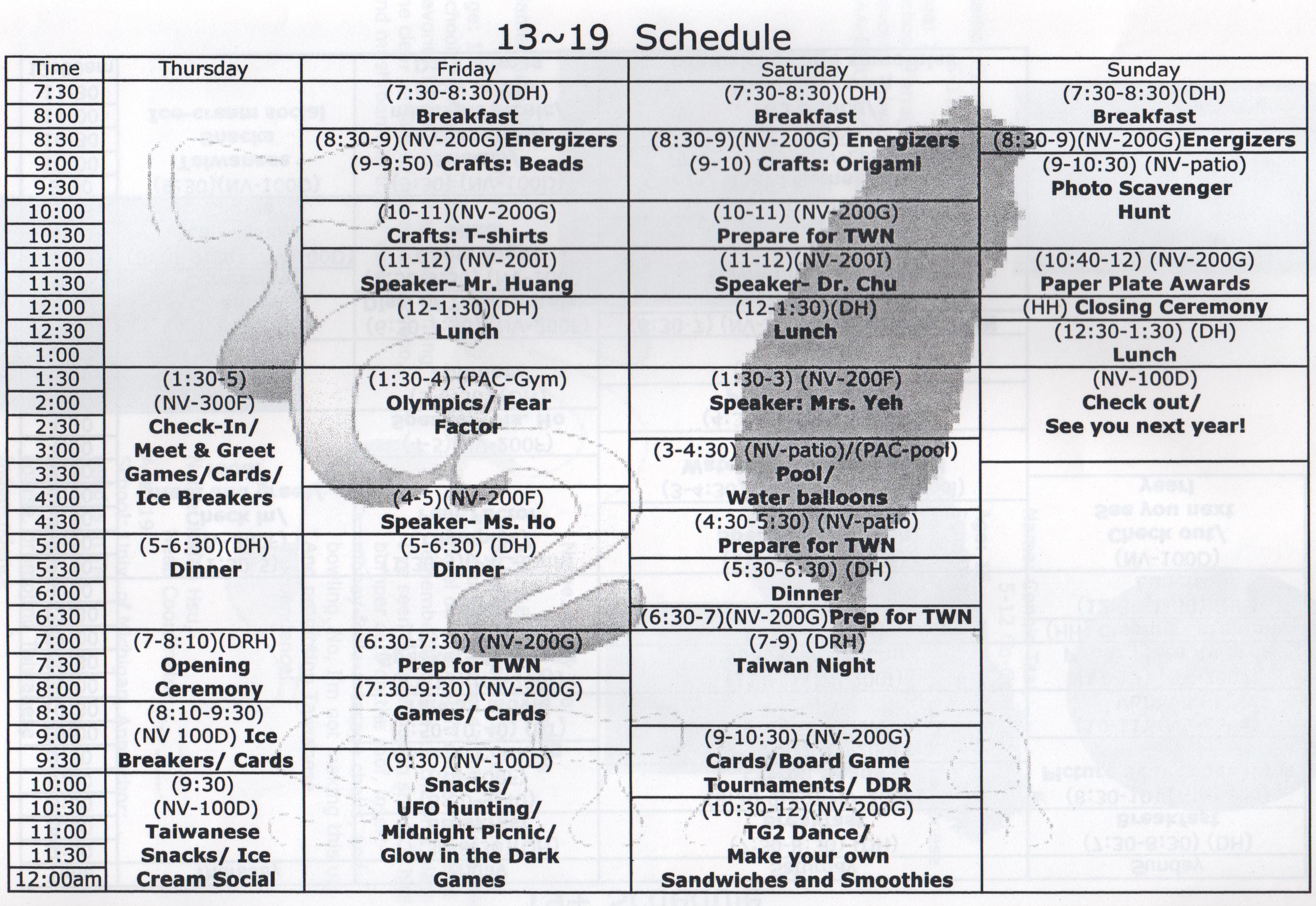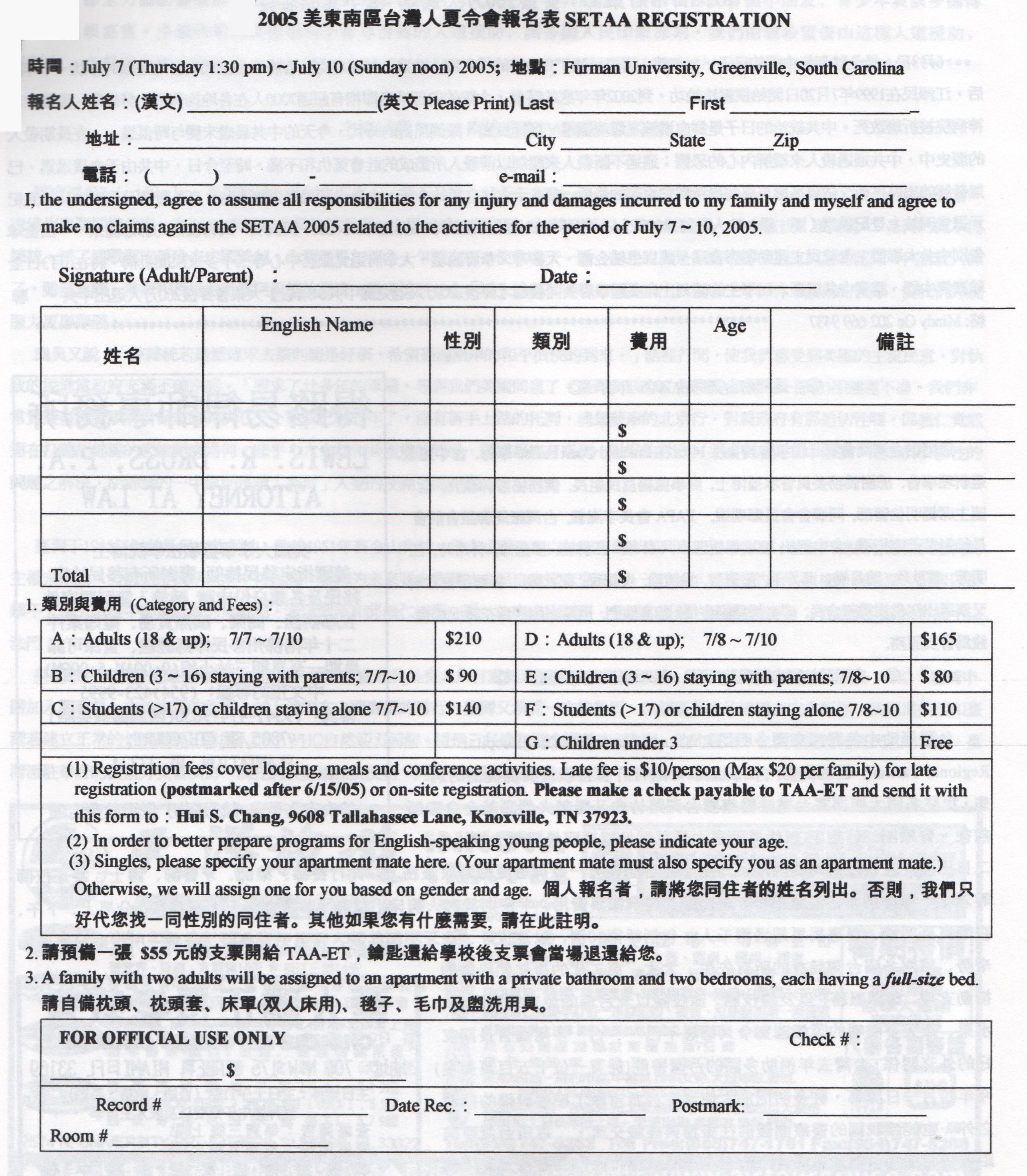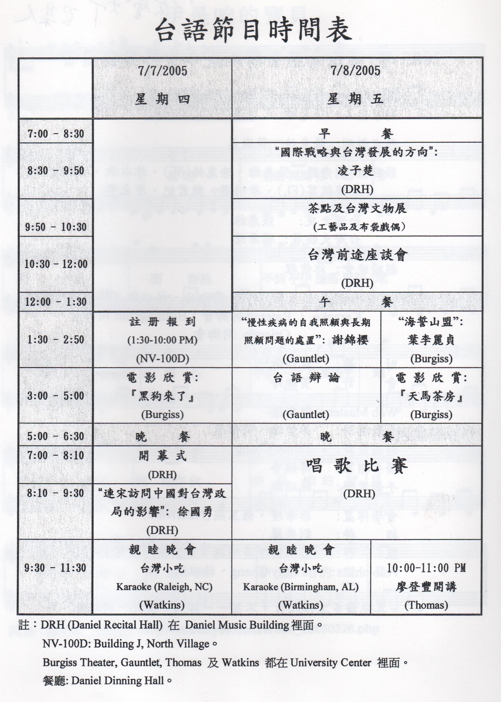 今年的夏令會,我們要大膽嘗試和往年不一樣的形式,要辦一個多元化、輕鬆、有趣的聚會。除了往常舉辦的專題演講、座談會及台灣之夜外,今年的夏令會,還將舉辦台語趣味辯論競賽、歌唱比賽、電影欣賞、土風舞及烹飪班等。我們還要提供精美的台灣小吃。早上演講中休息時間,我們將舉辦台灣文物展覽。每天展出不同的文物。目前計劃展出的包括:(1)台灣木雕、(2)台灣原住民服飾、和 (3)布袋戲偶。在休息時間,我們也將提供點心及茶水等。在食物方面,我們將特別準備美味的台灣小吃。在晩上9:30到11:30的親睦會上,星期四,我們將準備彰化割包、茶葉蛋、涼拌菜和綠豆湯。星期五,將有客家刺穀糕、滷肉涼拌麵、涼拌菜和白木耳鳳梨湯等。星期六,將有新竹肉圓、土豆、涼拌菜和到冰等。爲了讓各位鄕親,有足夠的時間,享受我們爲您們準備的節目,今年的夏令會,特地從往年的三天二夜,擴大爲四天三夜。田納西的台灣同鄉,將以最大的熱誠,籌辦今年的夏令會。我們衷心盼望各位鄉覩,前來共襄盛舉。相信這是一個不一樣的的夏令會,會讓各位有一個滿意和難忘的回憶。謹附上報名表,希望到時在Furman University和大家見面。聯絡人Hui S. Chang(張惠雄)at(865)693-8675 or email: hchang@utk.edu 召集人 徐會炘敬邀 Tel: (865) 966-2965 hueyhsu@aol.com