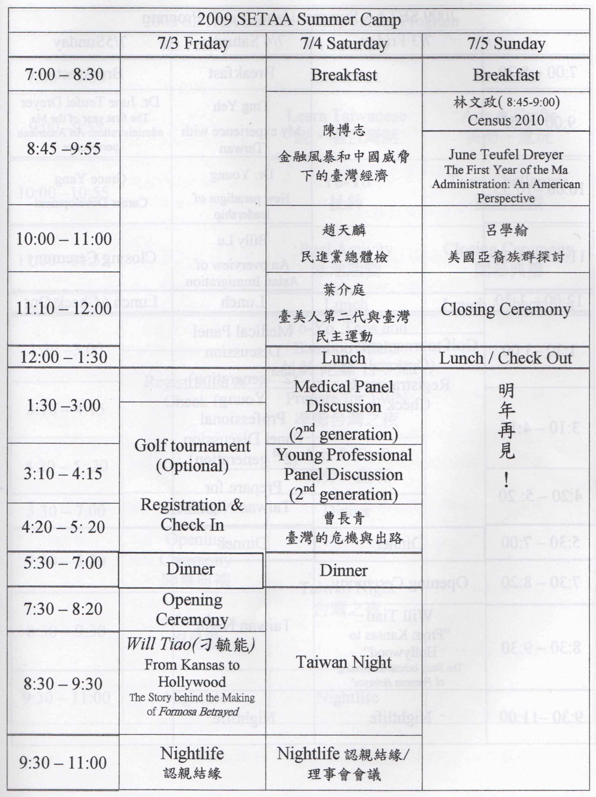 自從臺灣馬政府上台後,「馬上」翻臉。 在中國黨「反獨促統」政策下,大幅親中、媚共。過去廿年臺灣本土政權所努力追求,辛 苦建造的民主自由制度,不到一年時間已幾乎被摧殘殆盡,臺灣人的權益汲汲可危。面對劇 變的國際政、經情勢,夏令會籌備會擬將邀請臺灣、美國的菁英一起探討臺灣民主政治、經 濟、兩岸關係、司法與人權等議題。計劃中有 前經建會主委,現臺灣智庫董事長陳博志教 授;民進黨青年部主任趙天麟;中國問題專家 邁阿密大學政治系金德芳教授(June Teufel Dreyer);以及電影“被出賣的臺灣”(Taiwan Betrayed)製作人刁毓能(Will Tiao)將應邀蒞臨 夏令會一起來探討我們所關心的臺灣。此外臺美人第二代已相繼在美國社會成長茁壯,夏 令會籌備會也將邀請年青世代來分享他們奮 鬥過程,這些不僅是老台美人的驕傲,也會 是年青一代同儕的榜樣。