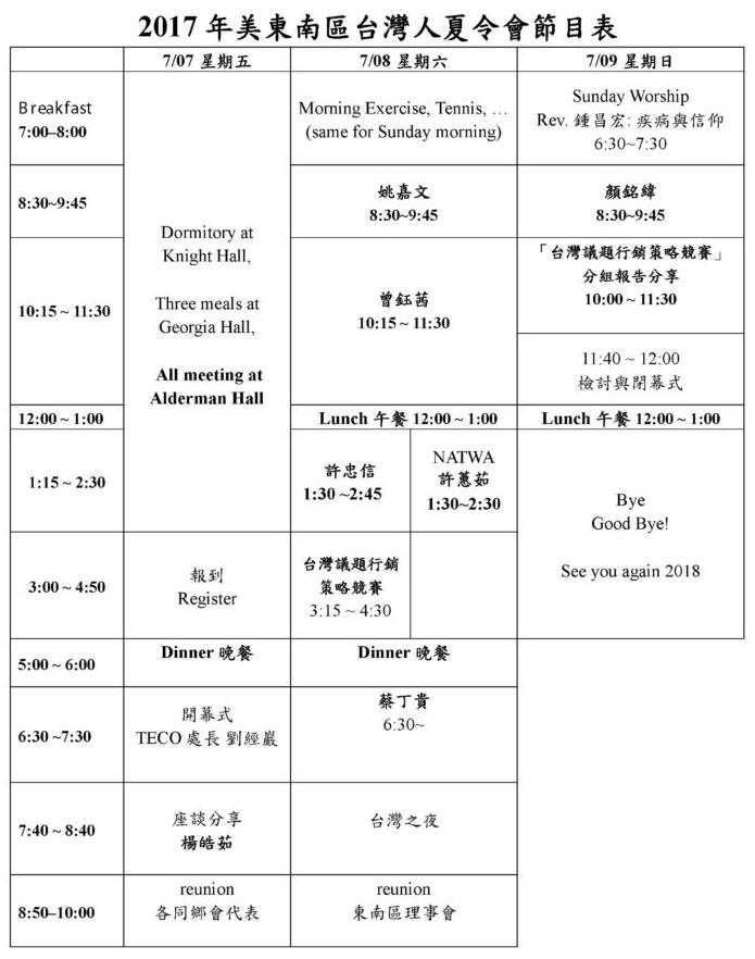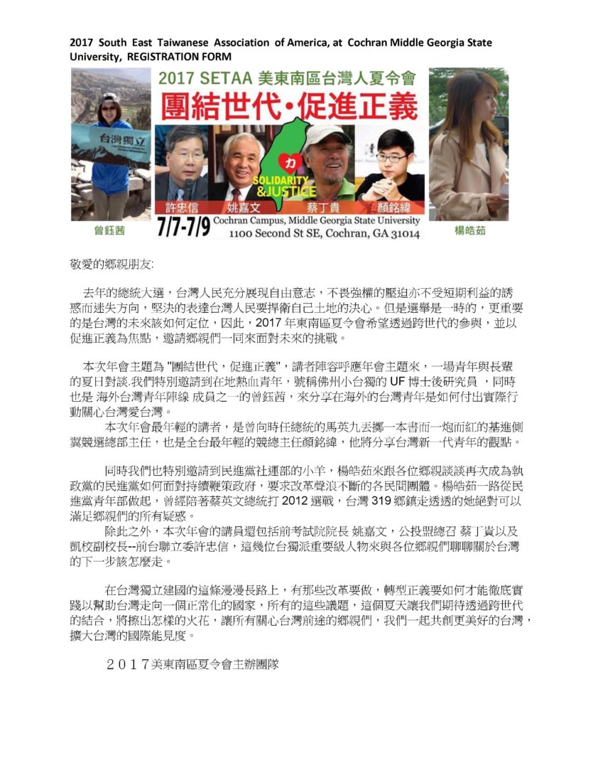 Several things important for this conference: 1. Young and old Taiwanese must cooperate in this event for better Taiwan future. 2. Speak out your idea for better conference, better Taiwan; we have good speakers, friends next to us to solve your question. 3. How we can do better job in rental car reimbursement program in fifth years. 4. How we appreciate people work hard for SETAA ? We should Respect our older Taiwanese and How to encourage young people to help Taiwan, so we can help others. It is just like old time wisdom shining through whole new Taiwan era.