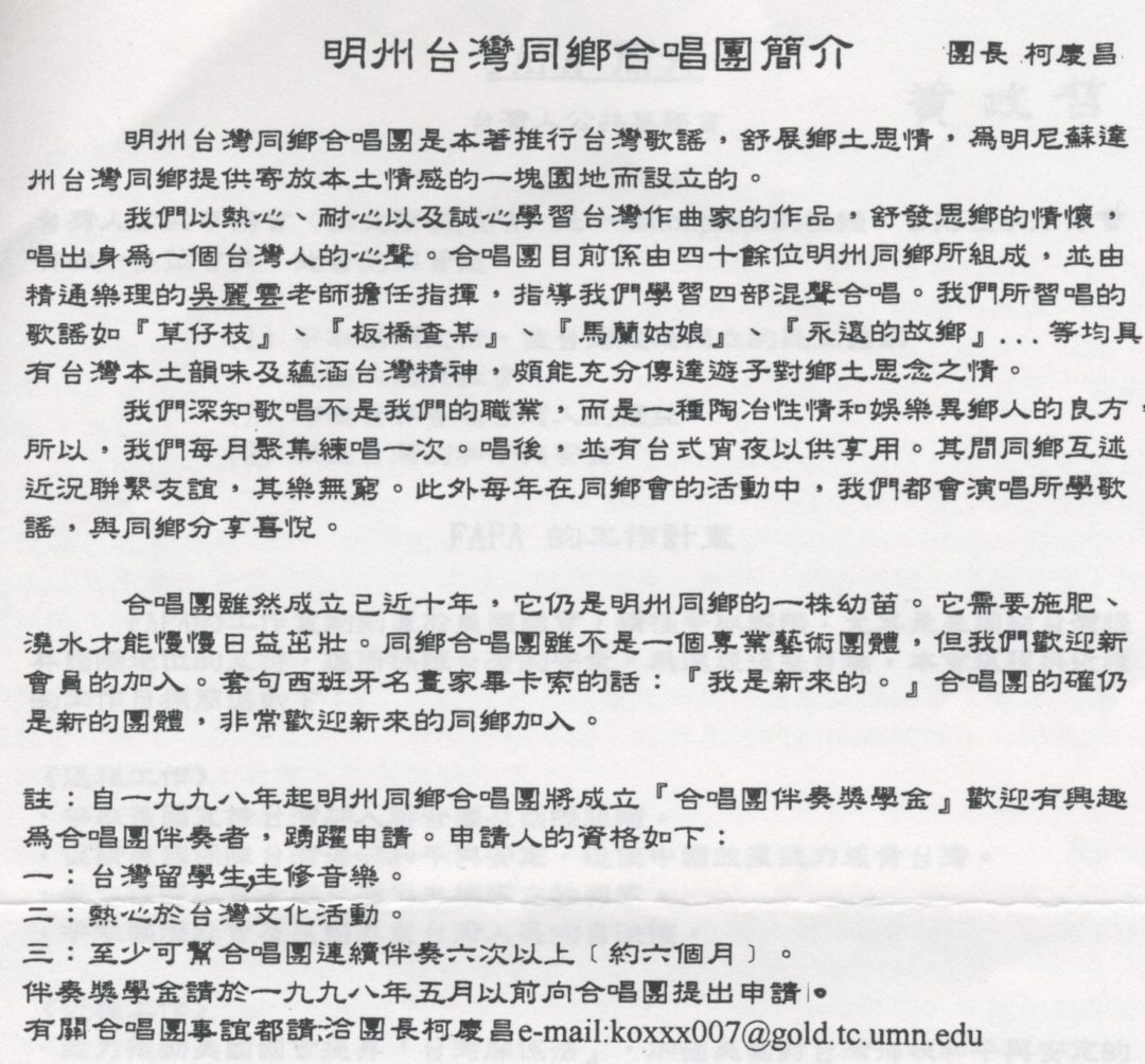55. 明州台灣同鄉合唱團 February 13, 2017 Admin1 Music Organization Source from 台灣明州同鄉會會訊 1998年正月 Posted in 02/2017