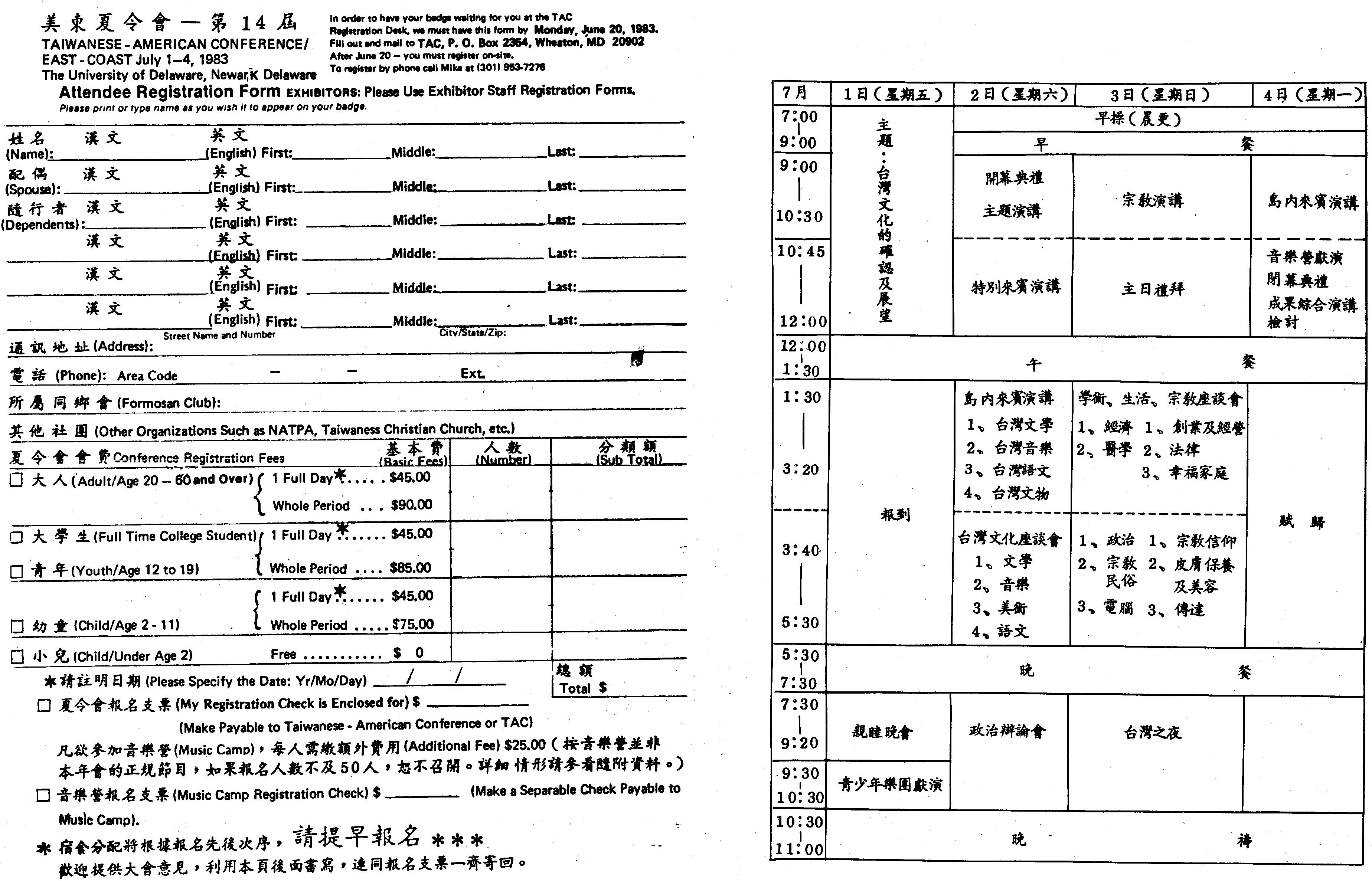 台灣政治討論會的日程暫訂於七月二日晚上八點至十二點。籌備會只透過公開性邀請,並不另行單獨邀請,希望有意出席這項政治討論會之政治團體,在六月十二日以前與該會連絡,該會將於六月十九回覆有關詳細的討論程序與規則。該會通訊處是:T.A.C./E.C., P.O.Box 2354, Wheaton,MD. 20902.