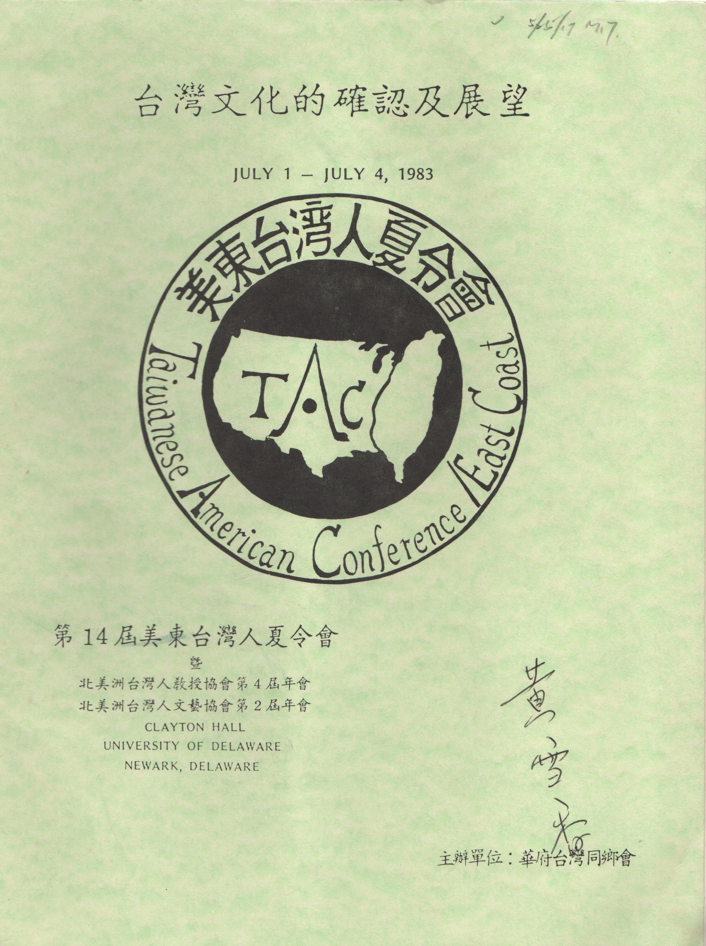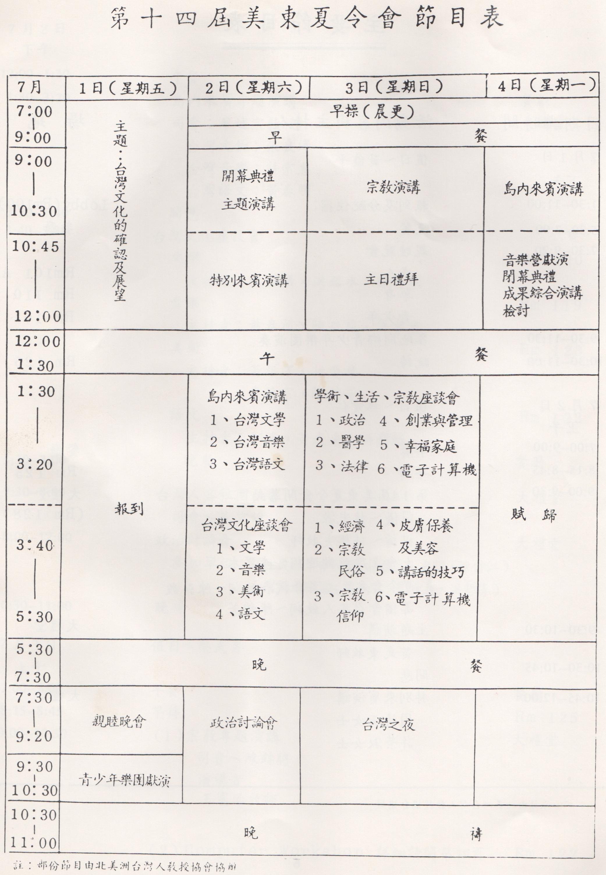 第十四屆美東台灣人夏令會暨北美洲台灣人教授協會第四屆年會及北美洲台灣人文藝協會第二屆年會於七月一日至四日,在德拉威爾大學盛大召開,共有一千六百多位鄉親參如,破歷史紀錄。四天的各項活動主辦單位的妥善籌劃中,一一順利進行,充分表現出各社團之間與各執行部門之間的充分合作與團結,稱得上是一次相當成功的聚會。