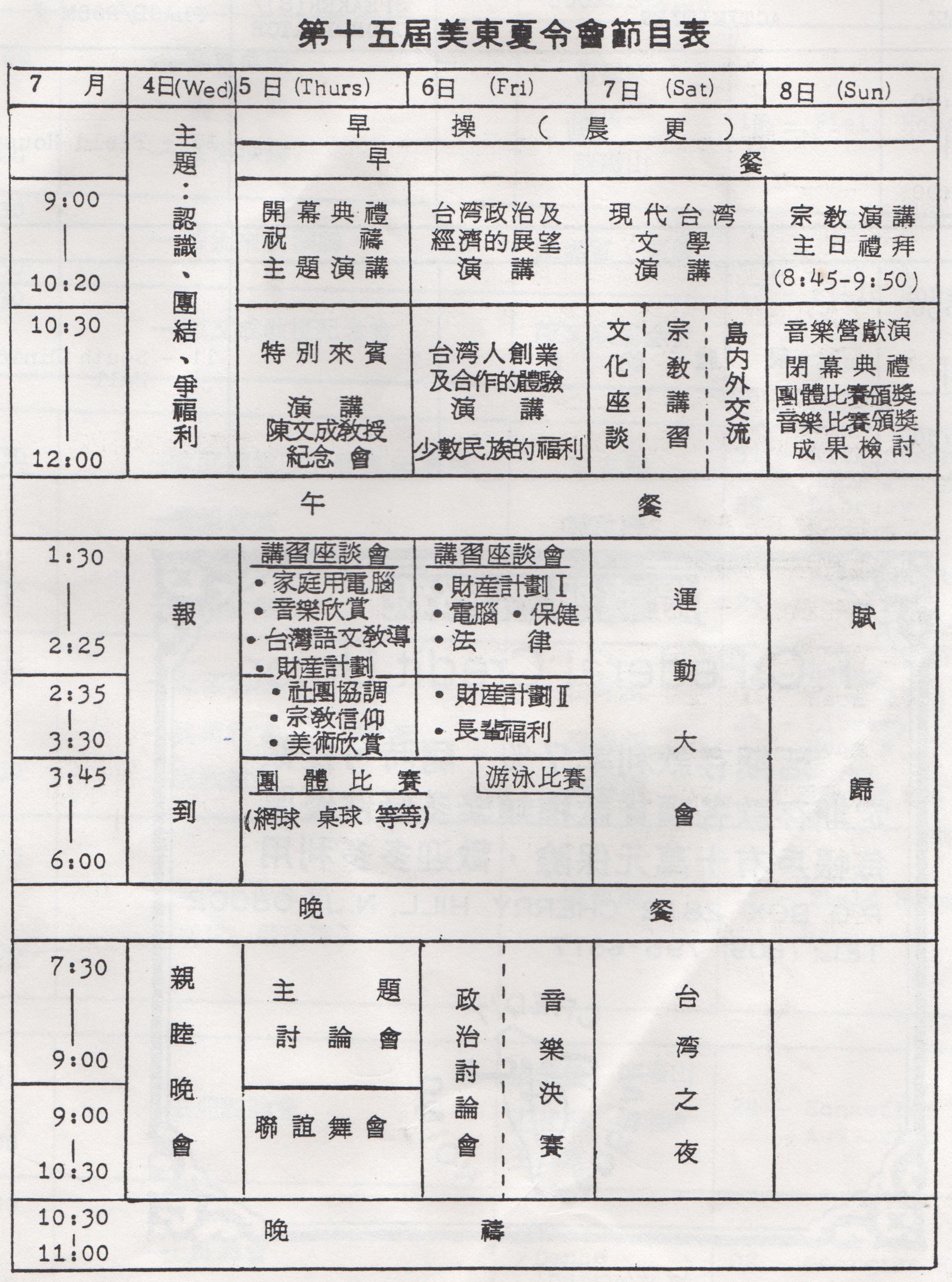 節目方面除了有政治、經濟、文學、宗敎、財務、保健、語文、法律及藝術等專題討論外,並將擧辦多彩多姿的台灣之夜聯誼晚會。同時,在運動方面,將以分區組隊競賽方式擧型團體運動比賽,項目包括:拔河、網球、桌球、接力等等,在音樂方面,除繼續擧辦靑少年音樂營由陳敏庭先生負責外,並將舉辦首屆美東台灣人夏令會音樂比賽,促進台灣人音樂活動提昇。