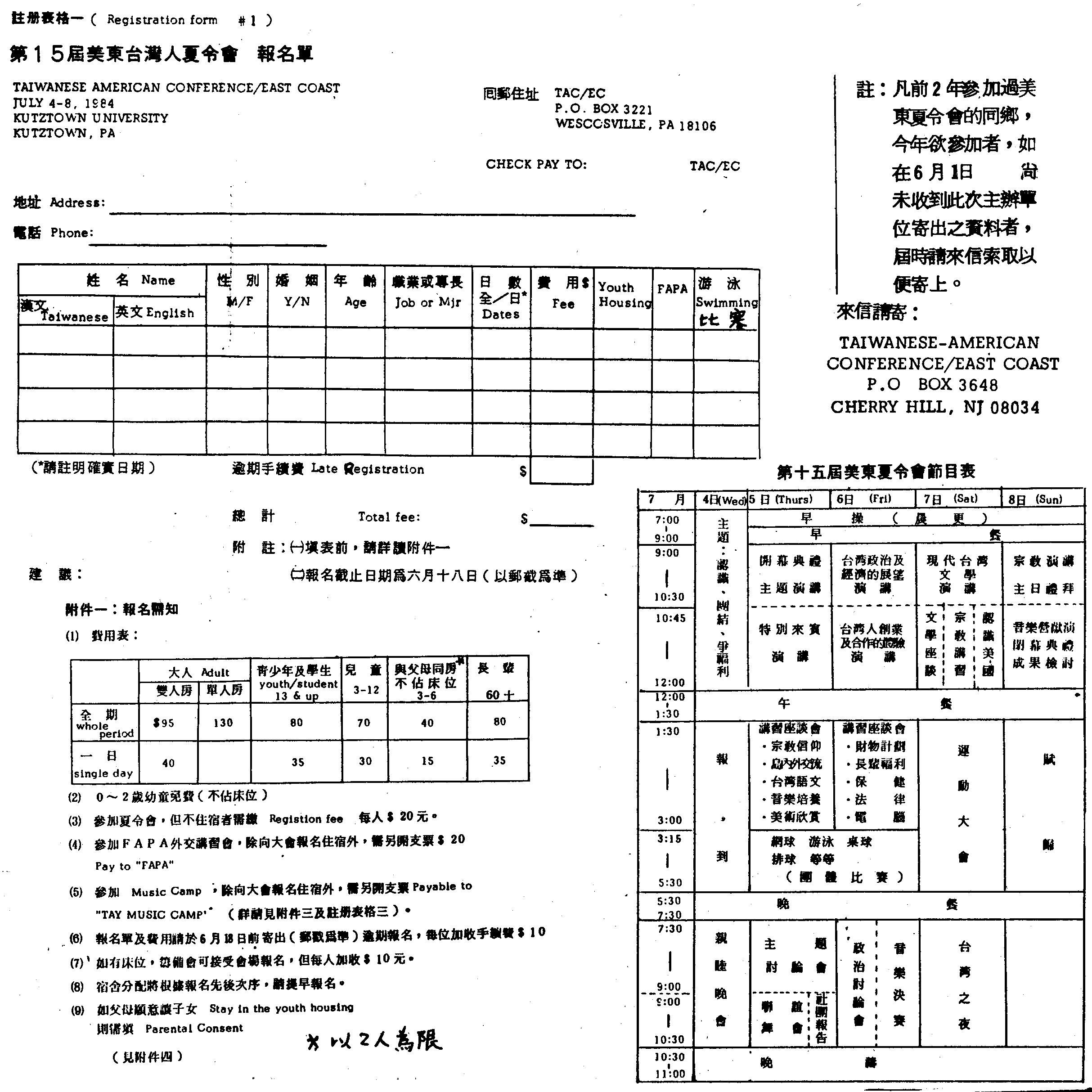 根據籌備單位表示,爲解決衆多鄉親住宿問題,幾經接洽,該校已同意再撥出近三百房間供夏令會使用,連同已有宿舍,預計可容納兩千位同鄉。主辦單位特別呼籲同鄉儘速報名,截止日期延至六月廿五日止,逾期或現場報名者另加收十元。同鄉報名參加除用籌備會印發正式報名表外,可以利用《台灣公論報》上美東夏令會報名單(詳見本報第七版),或自行列出參加同鄉姓名、年齡及須繳費用,隨同支票寄達下址: