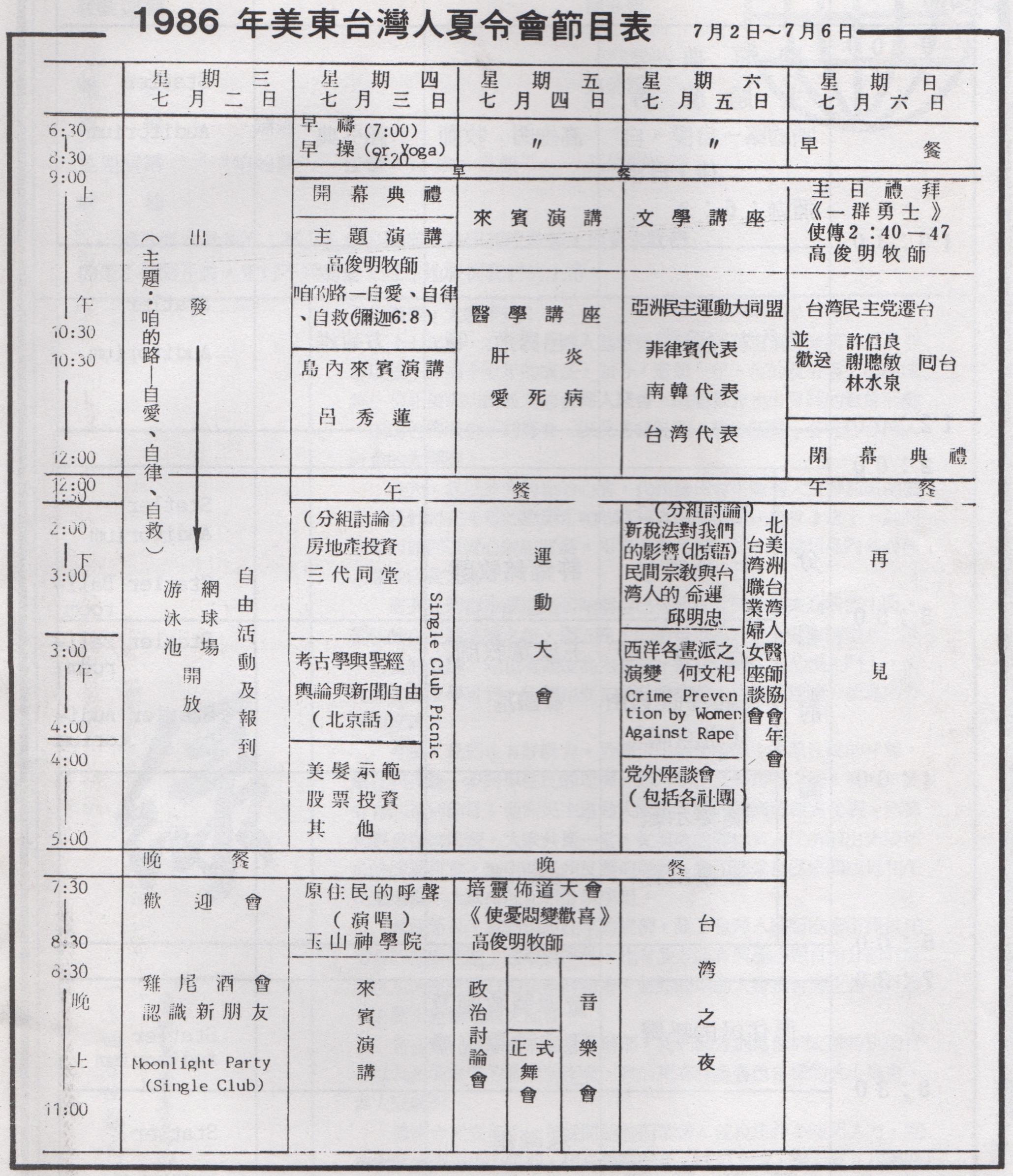 一九八六年美東台灣人夏令會已於九月七日組成籌備會,並選出賴弘典醫師爲召集人。賴醫師現任紐約恩惠歸正敎會長老,FAPA紐約分會會長,紐約台灣人醫師協會會長。