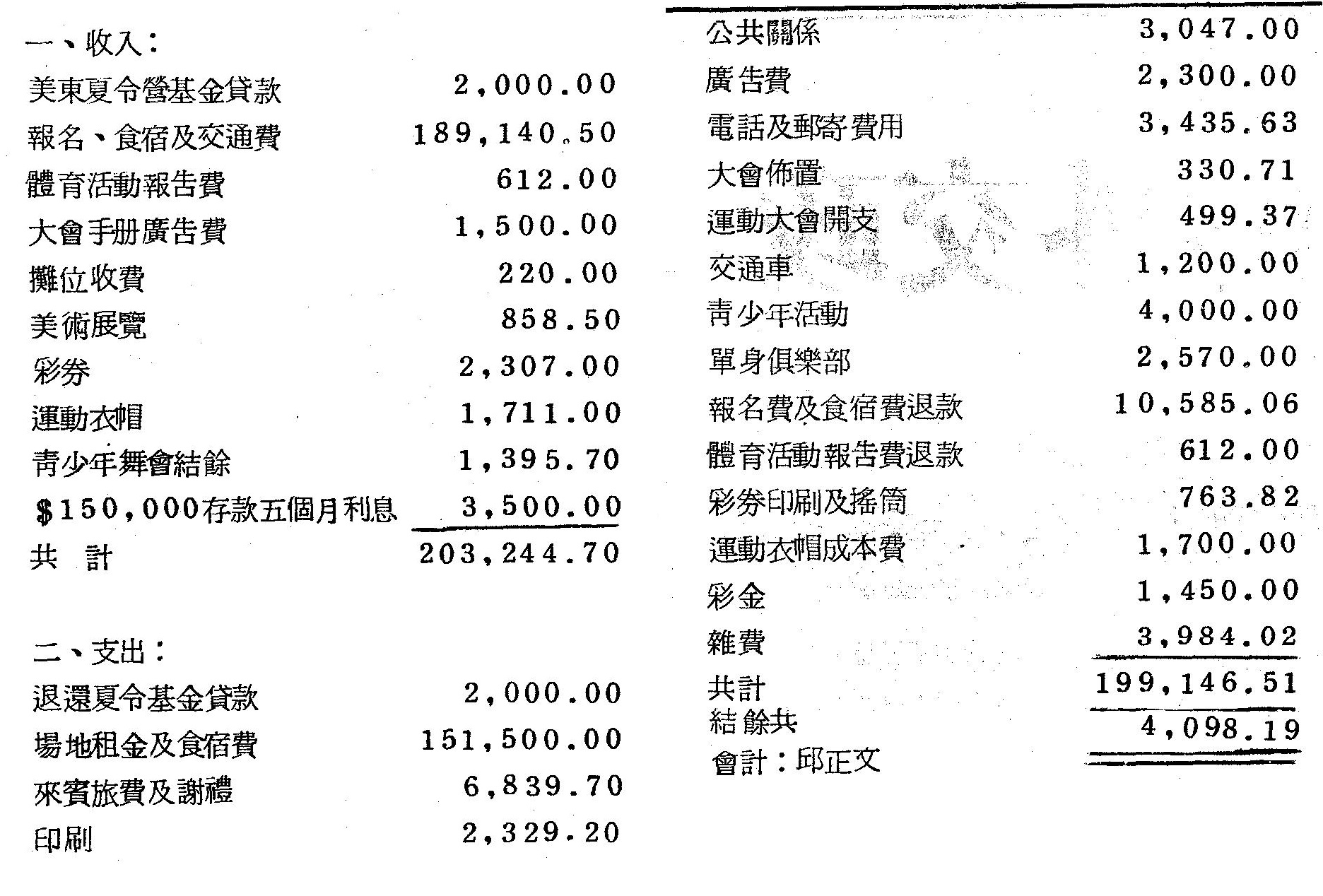 最後會計方面,夏令會閉幕才開始大忙,整個八六年度夏令會總收入共二十萬三千多元,開支共十九萬九千多元,結餘四千元,將全部存入美東夏令會基金內。詳細收支項目如下,若有疑問,歡迎指敎。