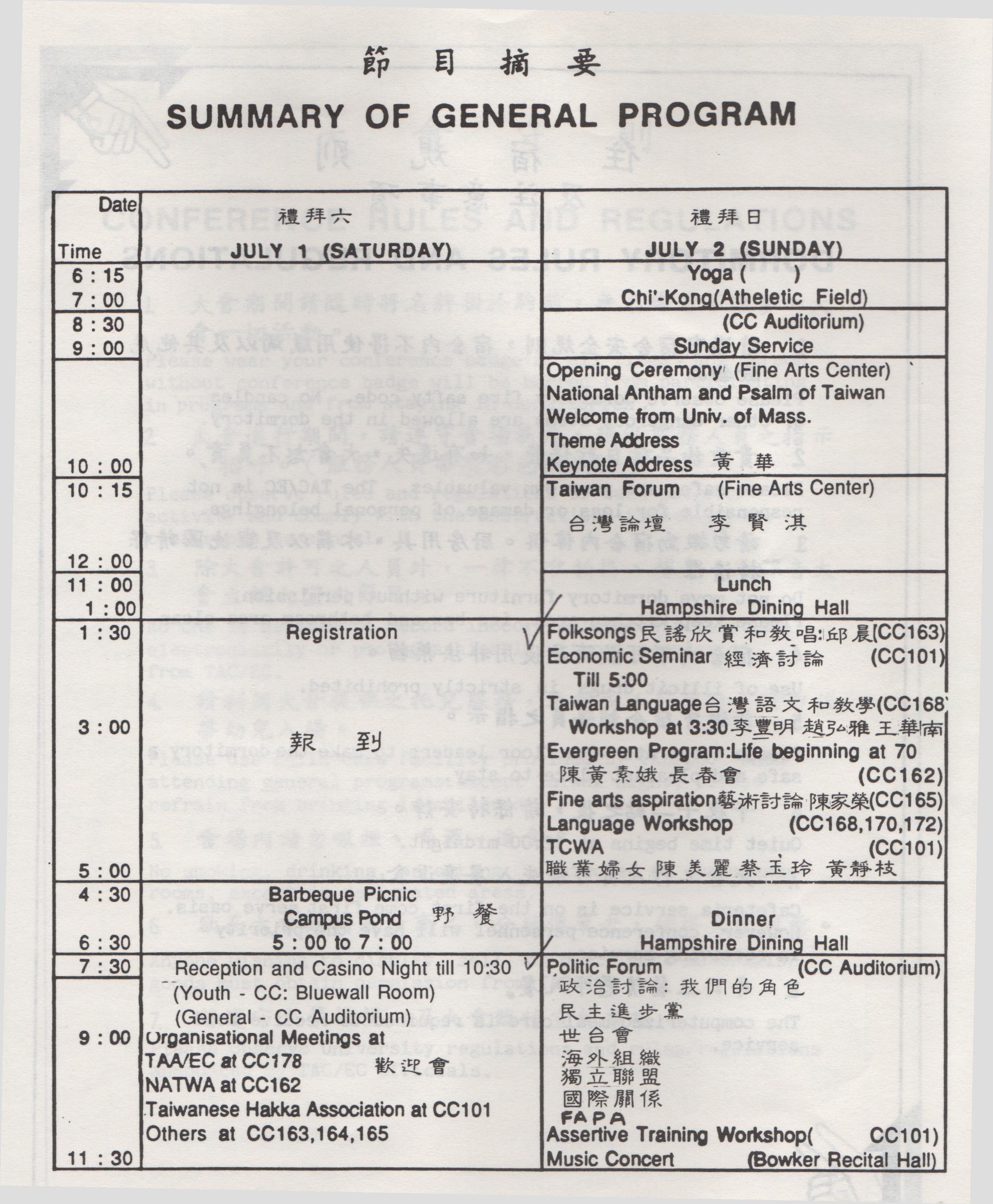 今年的美東台灣人夏令會,於七月一日在阿姆赫特麻省大學擧行。一進報到的地方,就看見秩序井然,成人組和靑少年組完全分開,心中暗自佩服大會工作人員的辦事能力,加上遇到老朋友們的高興,幾百哩的開車疲勞已囘復大半。領了鑰匙再把行李放好,冲洗換衫,就完全精神飽滿,跑到報到處,以等熟人的來臨。