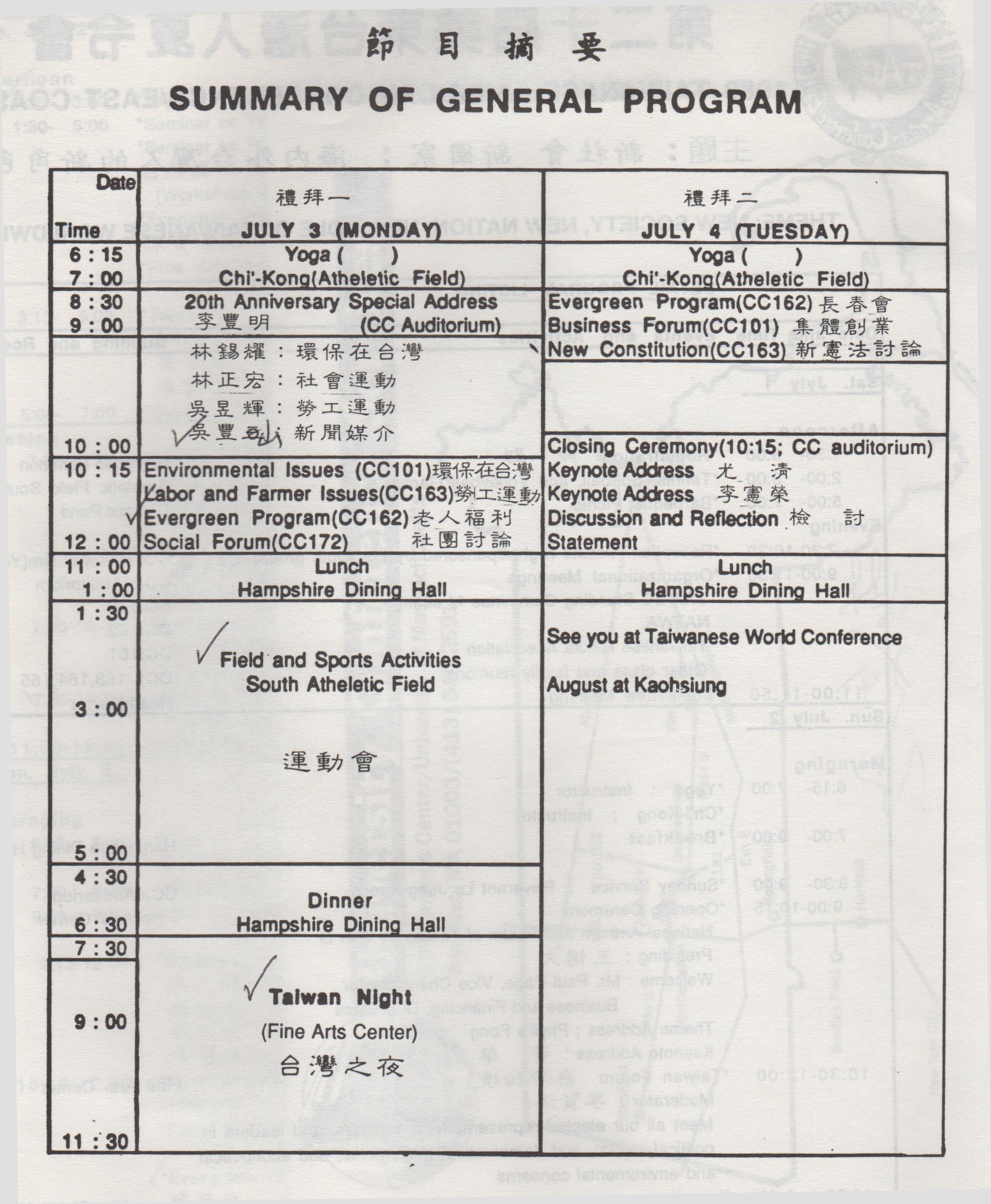 今年美東台灣人夏令會將慶祝二十週年,由費城、德拉威及南澤西三同鄉會組成的籌備會已決定於七月一日(星期六)至七月四日(星期二)假麻省大學(UNIVERSITY OF MASSACHUSETTE, AMHERST, MA)盛大舉行。雖然夏令會已在此擧辦過數次,但近二年來該校大興土木,建有數棟大樓,會議設備已達國際水準。