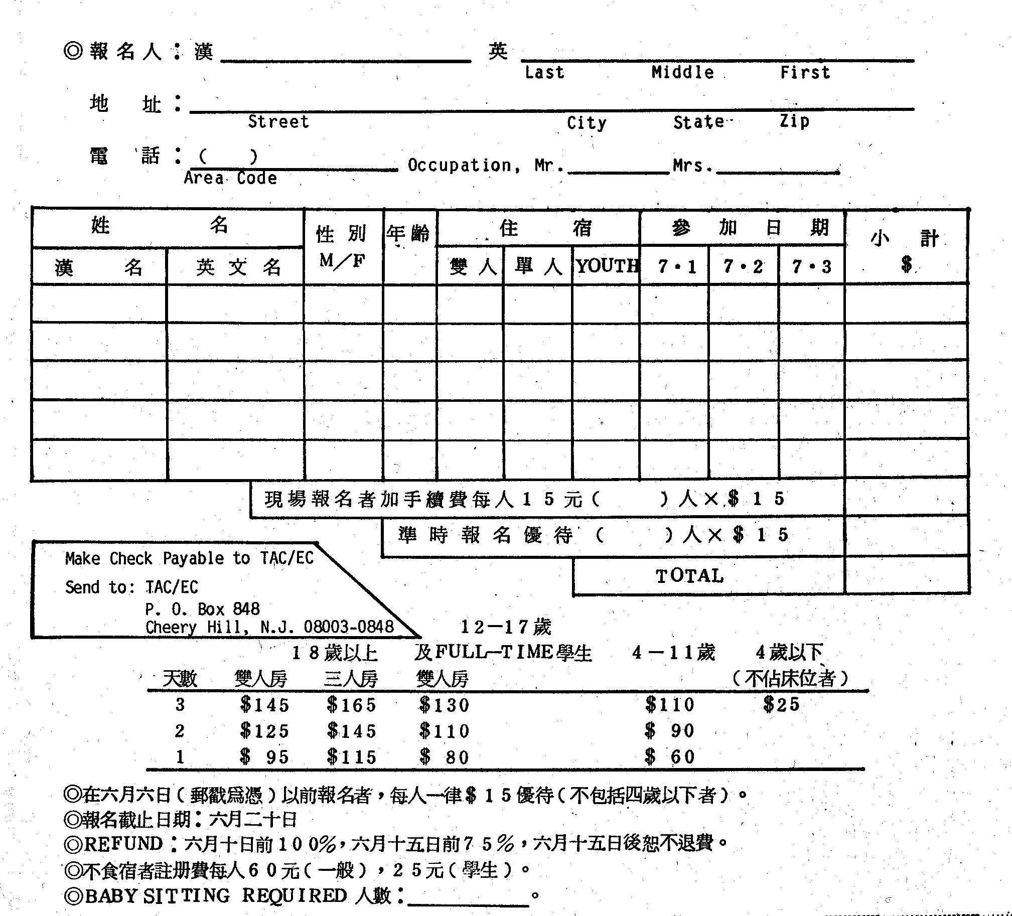 七月一日報到當天的晚宴是CHICKEN BARBEQUE,請大家儘早趕到會場。我們可以預料今年夏令會生日大慶必是熱鬧精彩的,請個同鄕趕早踴躍報名。六月六日以前報名者每人可享有十五元優待(郵戳為憑),報名截止日期是六月二十日;現場報名者每人加收十五元。欲在夏令會登廣告,排攤子者請與楊太太聯絡(三〇三〜七三一〜四七五五)134 CHAPEL HILL DR. NEWARK, DE 19711。最後祝各位同鄕快樂健康!REGISTRATION INFORMATION, CALL 609~428~1121(CHOW), TAC/EC, P. 0. BOX 848, CHERRY HILL, N. J. 08003-0848。