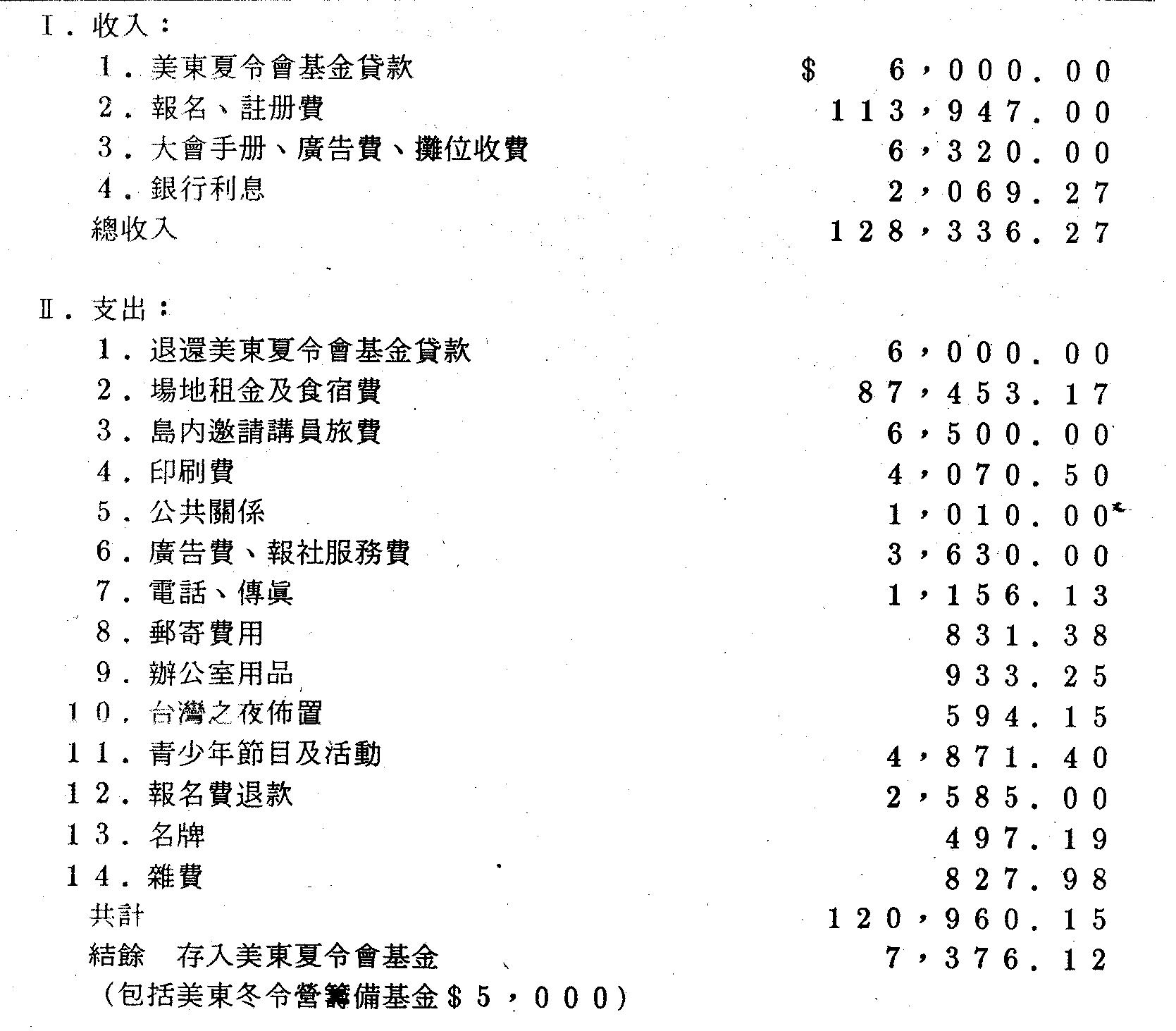 此一美東冬令會的宗旨、組織等有待大家討論,有寶貴意見者請與王博文聯絡(PO-WEN WANG, P.O. BOX 80, TREXLERTOWN, PA 18087)。以下是財務報告。
