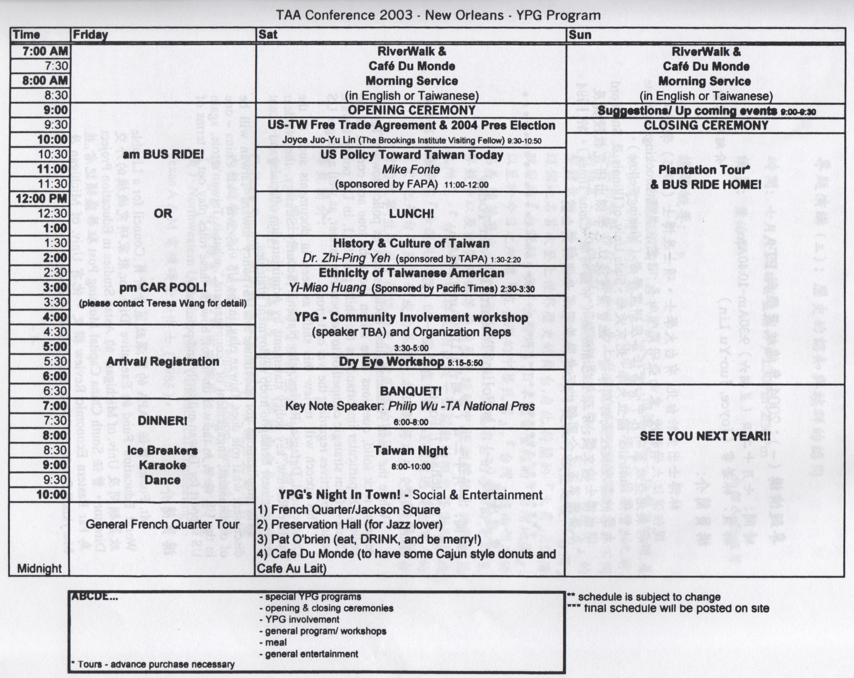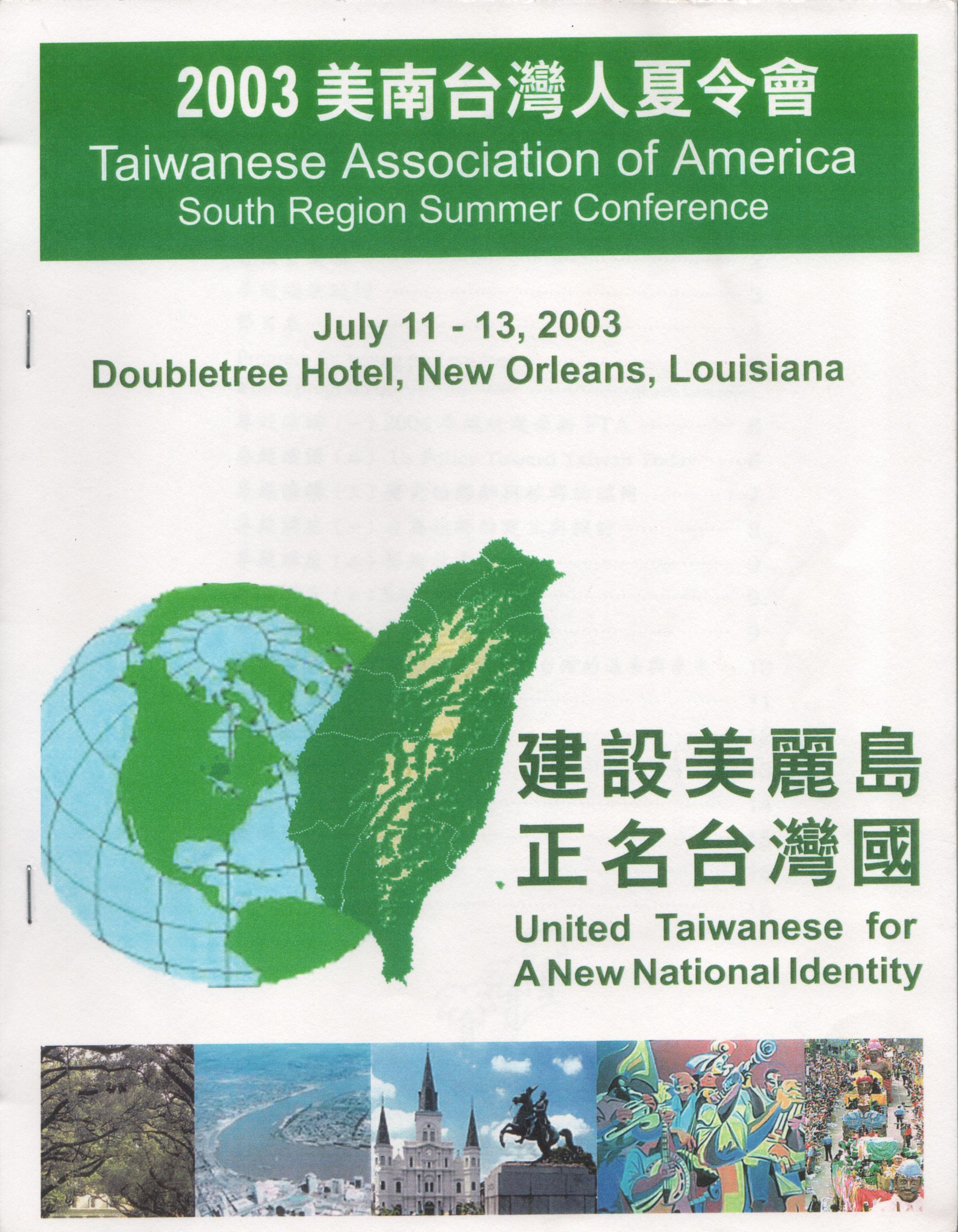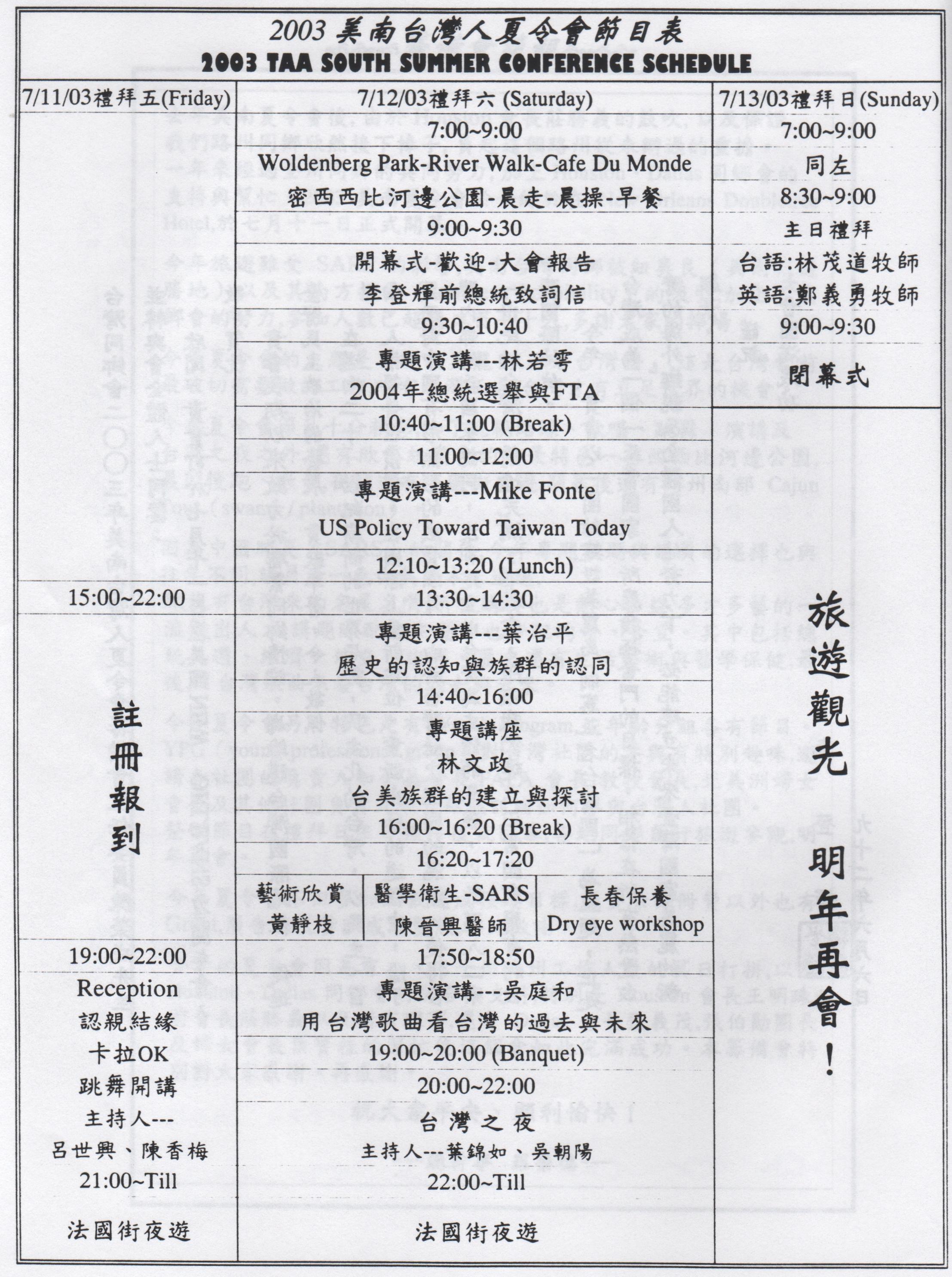 歷年來的美南夏令會攏走無會出德州的州界。休士敦與達拉斯的同鄉,一年又一年籌辦美南夏令會,辦得非常出色,從未叫苦。路州的同鄉則來回駛十外點鐘的路程去參加。由這也可以看出台灣人的團結。路州的同鄉這回不自量力,向天公借胆,承允主辦這次的夏令會,希望能圓滿達成任務。