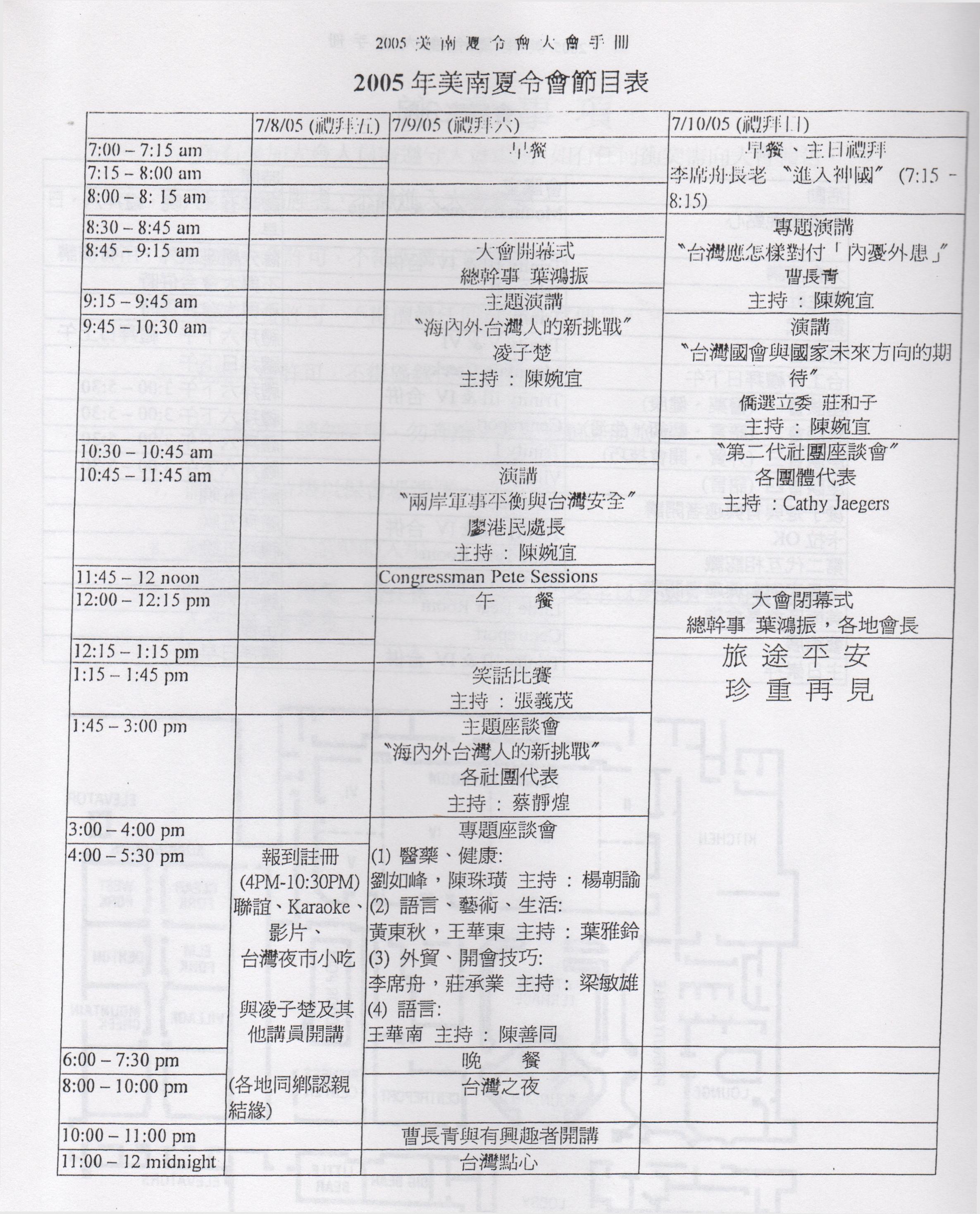 七月八日下午及晩上爲報到及交誼,正式節目在七月九日早上開始至月 十日中午結束。今年夏令會的主題爲”海內外台灣人的新挑戰”,大會正 安排令大家滿意的專題演講講員們。除了專題演講外,大會並準備其他講 座包括醫藥健康、婦女會、人權與政治、生活、產業科技、台美畫家作品 展等,週日早上還爲教徒們準備主日崇拜。