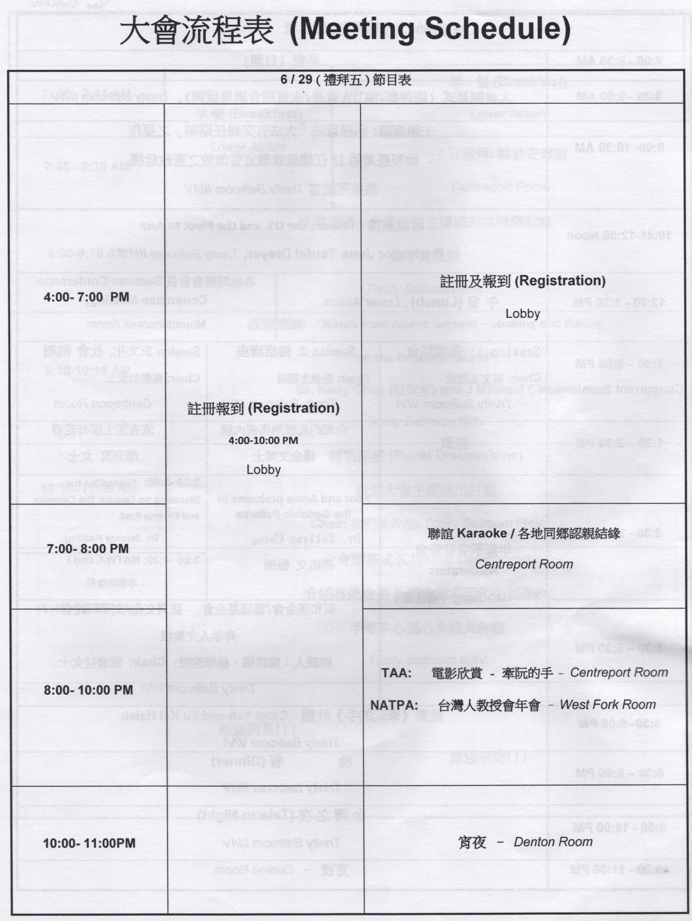 Welcome to the NATPA 2012 Annual Meeting in Dallas. We are glad to come to the South to have a joint conference with the TAA-South Summer Conference. In the past few years, we have rotated to have our annual meetings in different regions of the United States and Taiwan. By these arrangements, we can enjoy the opportunity to meet members and friends from separate regions.