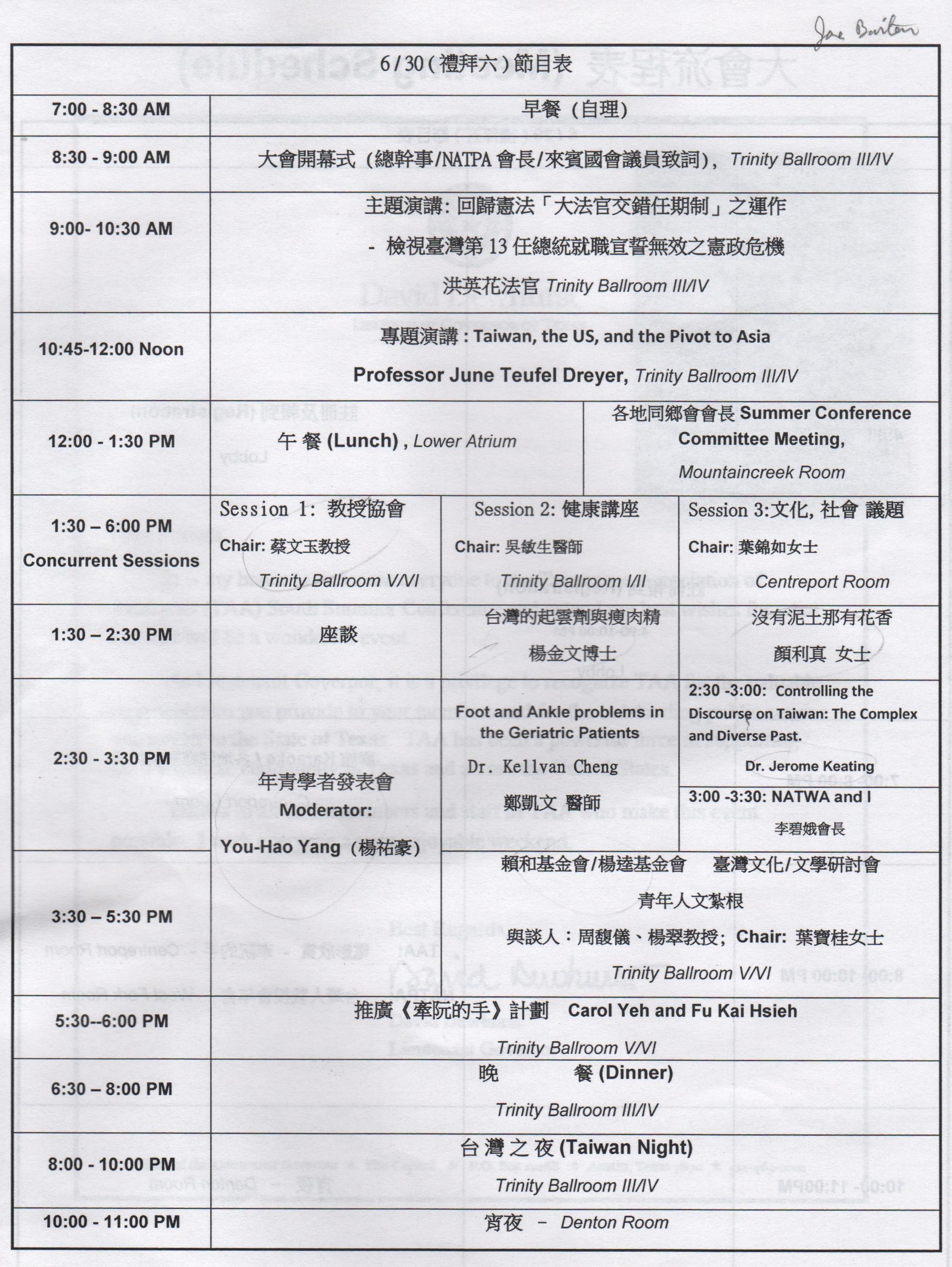 今年我們有洪英花法官、邁阿密大學政治系教授金德芳(Dr. June Teufel Dreyer)及台大土木系教授蔡丁貴擔任主題演講者。此外「賴和文教基金會」、「楊逵文教協會」、「鬥鬧熱走唱隊」,Dr. Jerome Keating,Michael Cole,顏利真女士及從本地出身的Dr. Ketty Chen都從台灣來達拉斯參加此次盛會。