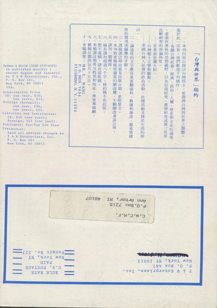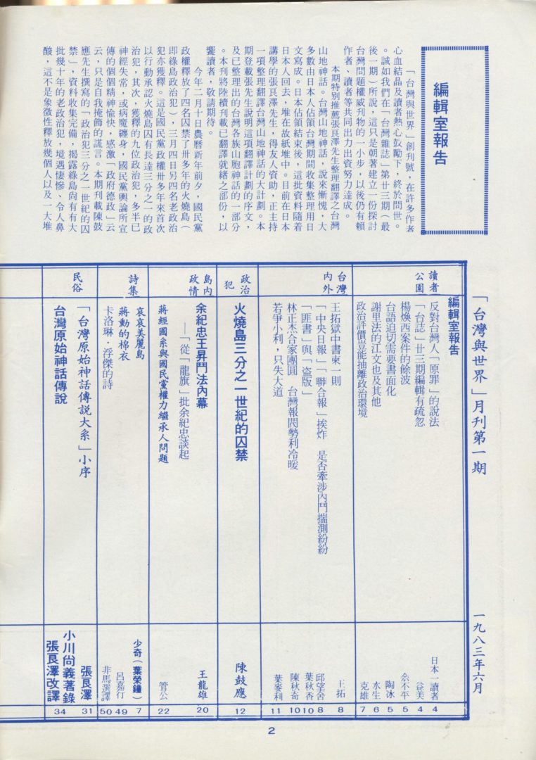 Taiwan and The World 台灣與世界 May 16, 2017 Admin1 09. Magazines Collected Issues : #1(06/1983) ~ 42(06/1987) Posted in 05/2017